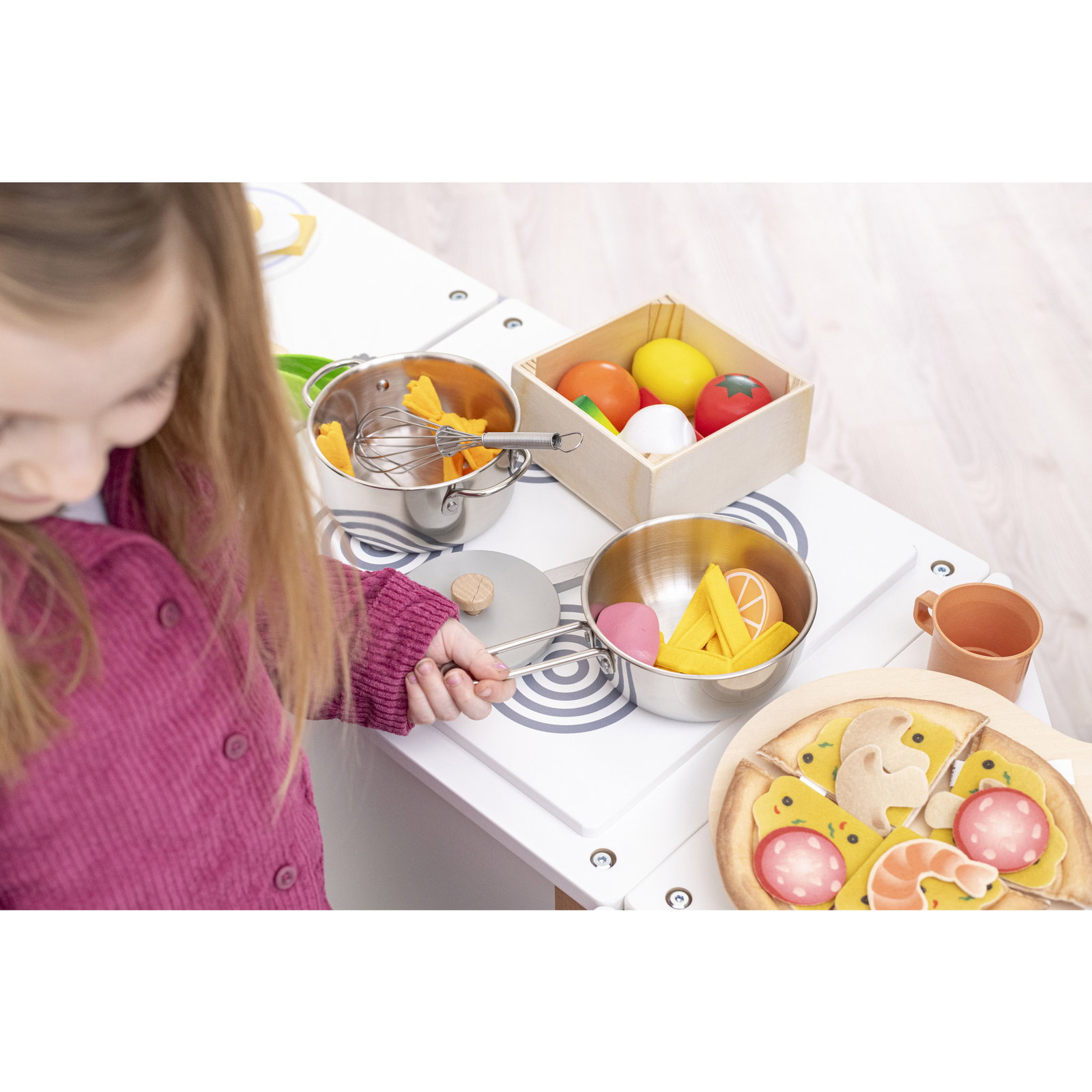 - Funktionale Türen & Fächer: Der Kühlschrank bietet Platz für Spiellebensmittel, und der Backofen lädt zum „Backen“ von Kuchen und Pizza ein. Das fördert die Feinmotorik und die Vorstellungskraft.