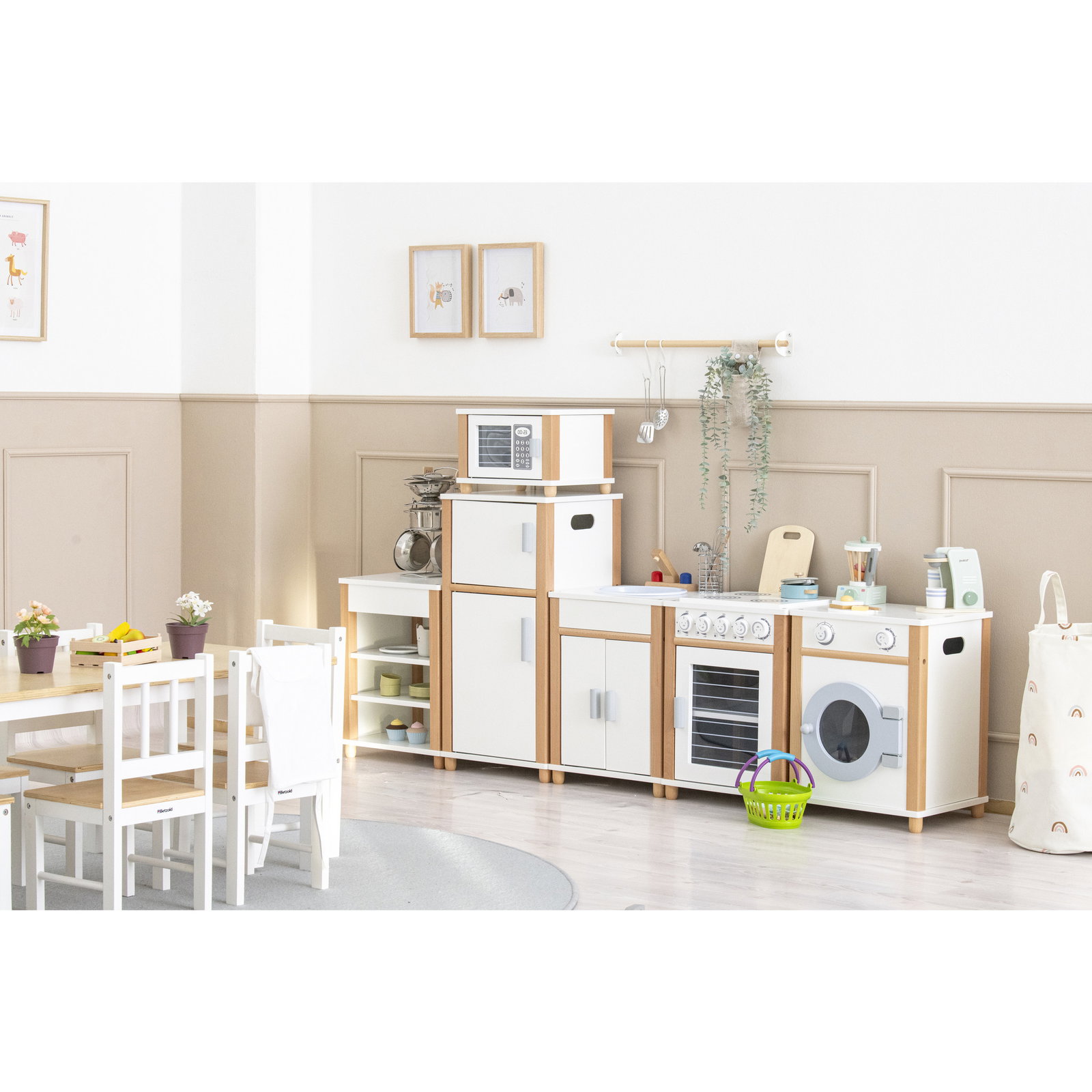 Die Küche besticht durch ihr realistisches Design und die robuste Verarbeitung. Ausgestattet mit Herd, Backofen, Kühlschrank, Spülbecken und Waschmaschine deckt sie den gesamten Haushalt ab. Das Besondere an dieser Ausführung ist das integrierte Küchen-Block-Regal: Es schafft nicht nur Ordnung für Töpfe, Pfannen und Spiellebensmittel, sondern erweitert die Arbeitsfläche enorm. So können Kinder parallel schneiden, kochen und servieren, ohne sich gegenseitig im Weg zu stehen. Die Kombination aus klassischem Weiß und warmer Buche-Optik macht die Küche zudem zu einem zeitlosen Blickfang, der sich harmonisch in jeden Raum einfügt.