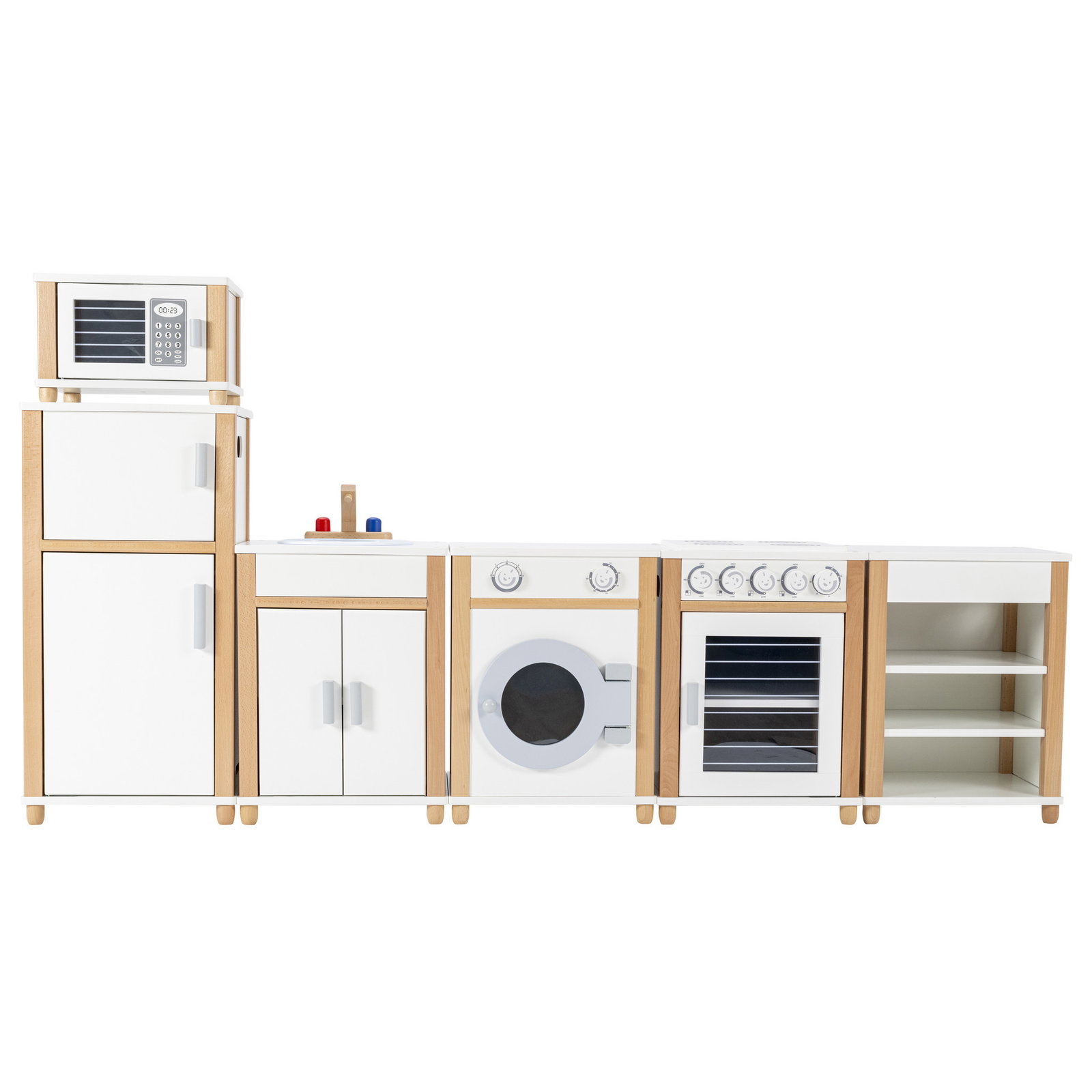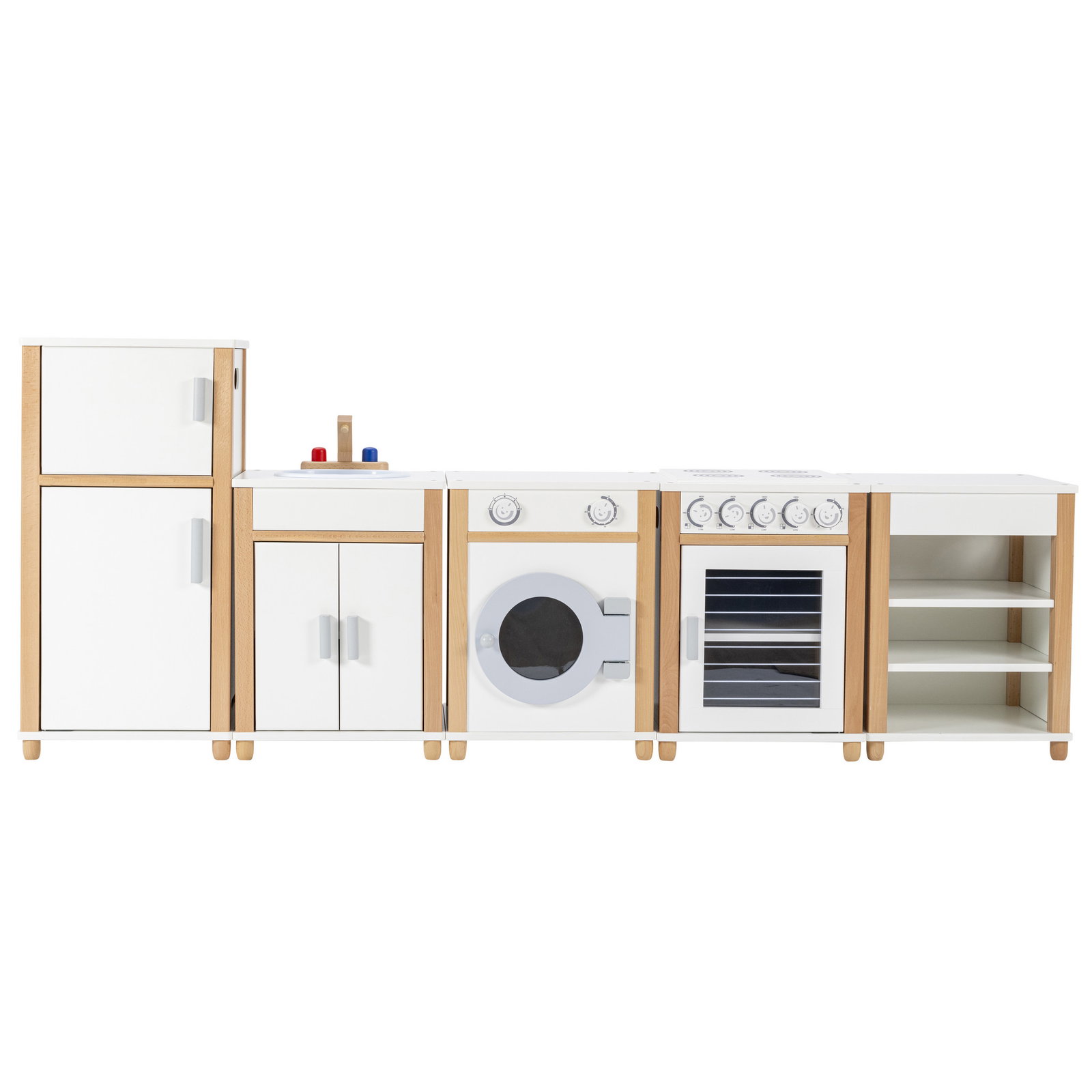 - Kompletter Haushaltszyklus: Vom Lagern im Kühlschrank über das Zubereiten am Herd bis zum Abwasch im Spülbecken und der Wäschepflege in der Waschmaschine – hier können Kinder den gesamten Tagesablauf der Erwachsenen authentisch nachspielen.