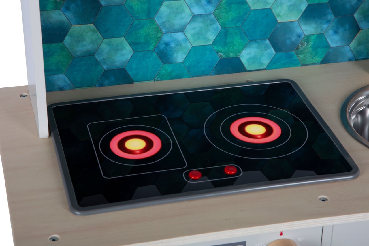 Diese Premium-Spielküche wurde entwickelt, um ein realistisches, interaktives und stilvolles Kocherlebnis zu schaffen, das die Kreativität fördert und sich gleichzeitig perfekt in ein modernes Wohnambiente integriert.
