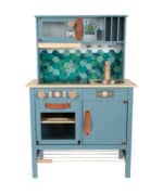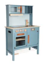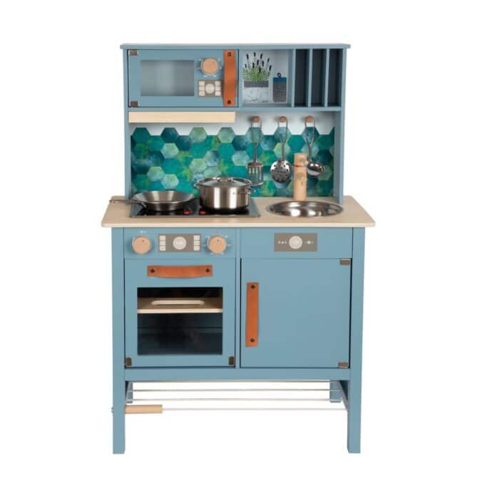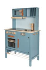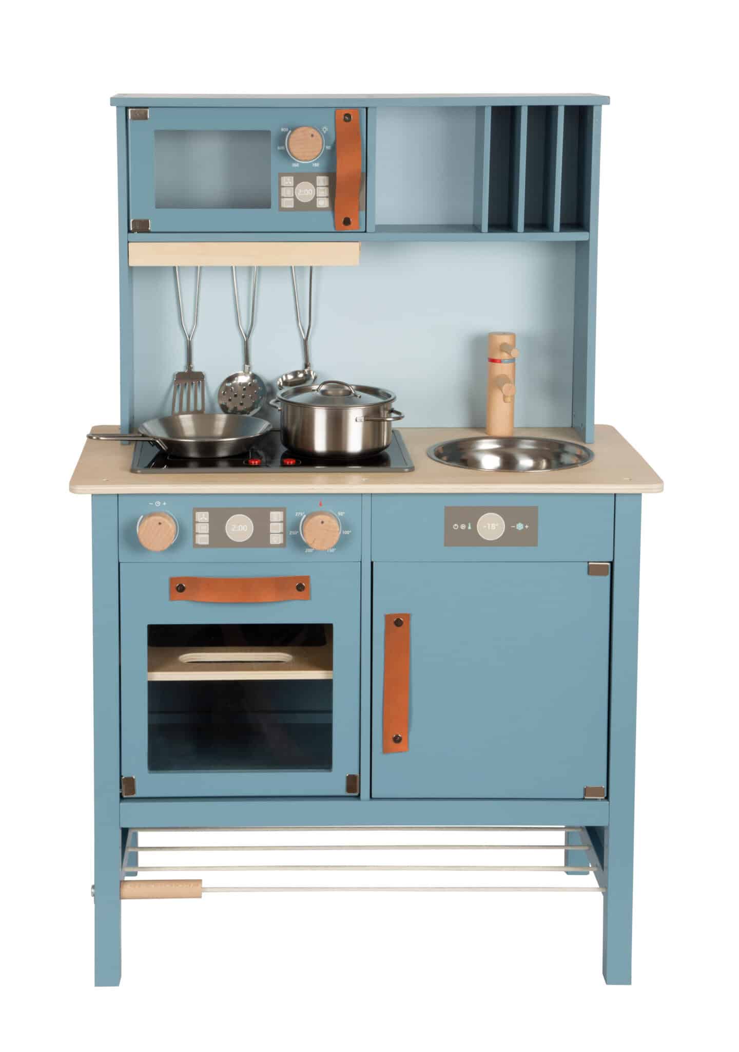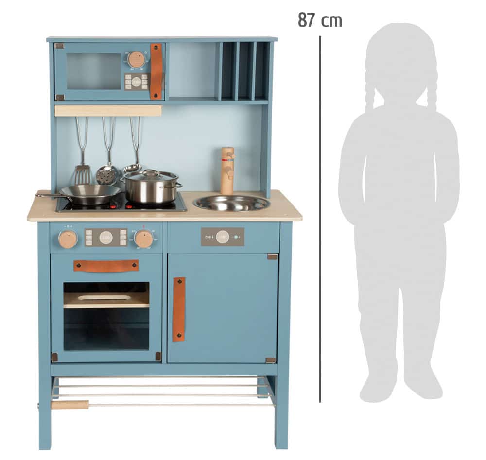 - Modernes Design, das Eltern überzeugt: Die stilvolle Kombination aus der Trendfarbe Rauchblau, Naturholzelementen und den edlen Griffen aus cognacfarbenem Kunstleder macht diese Spielküche zu einem echten Schmuckstück. Sie ist so ansprechend gestaltet, dass sie nicht nur ins Kinderzimmer passt, sondern auch im Wohnbereich eine gute Figur macht.