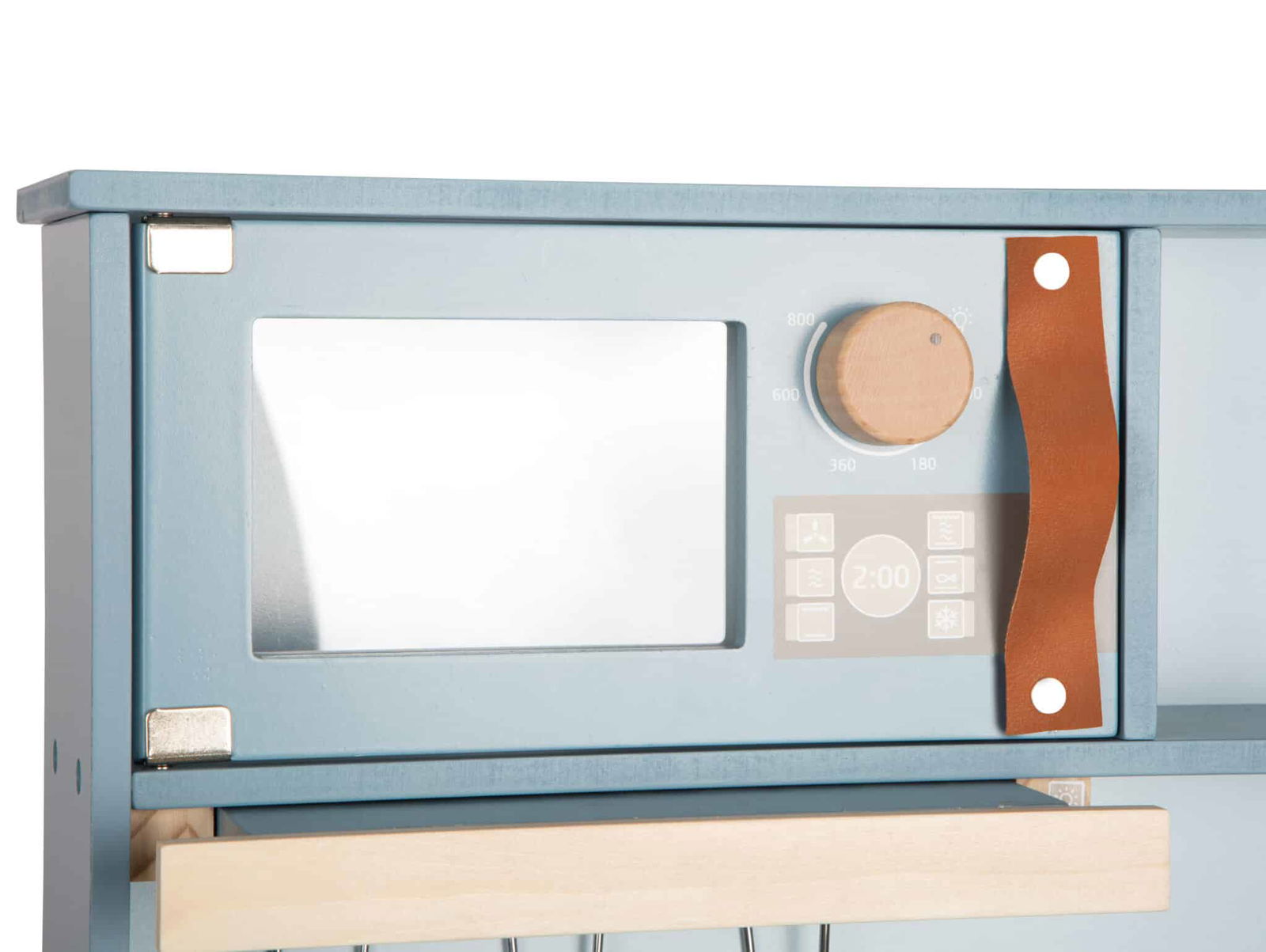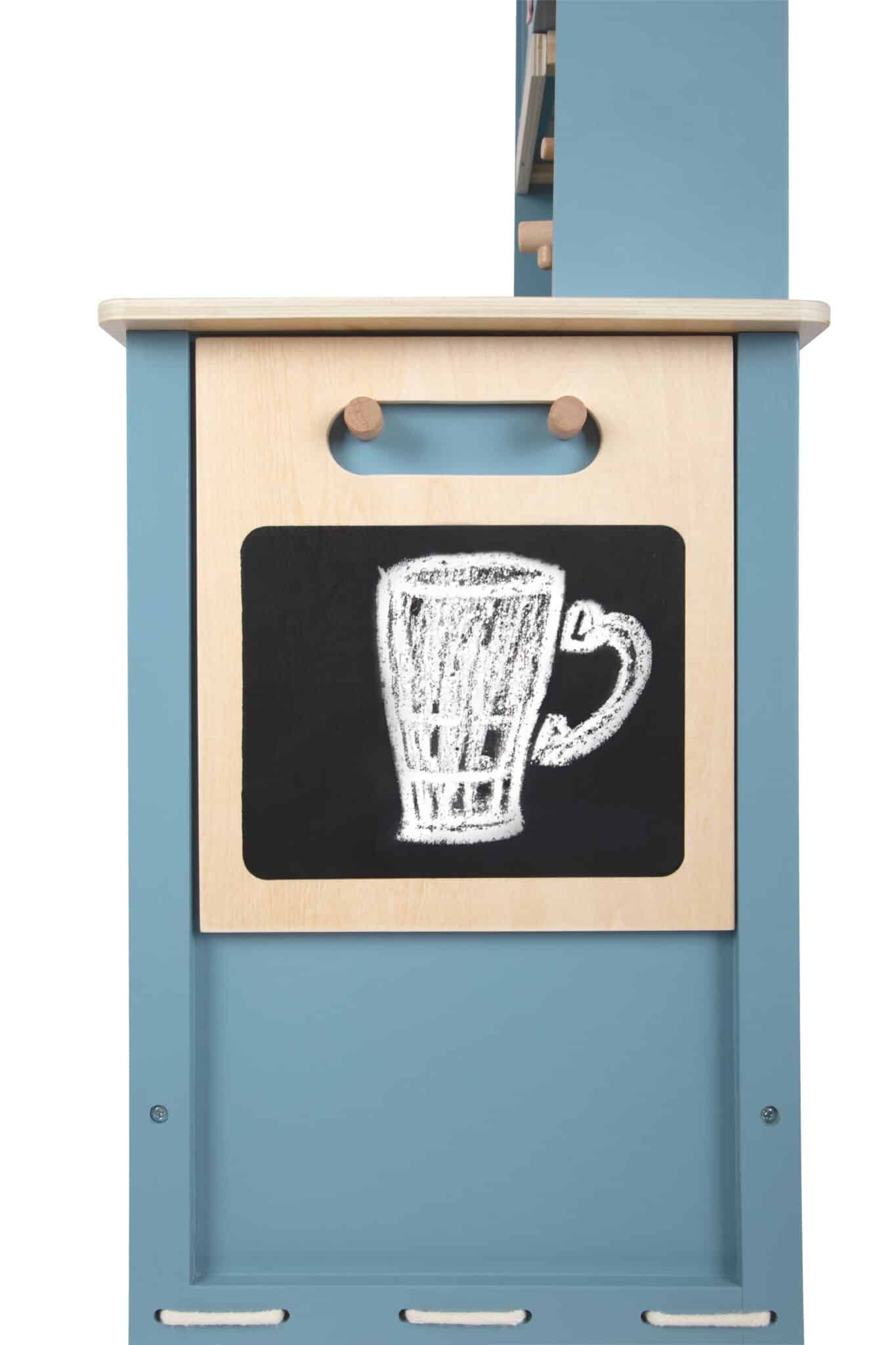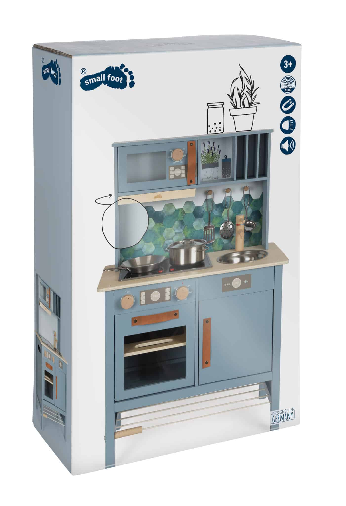 - Modernes Design, das Eltern überzeugt: Die stilvolle Kombination aus der Trendfarbe Rauchblau, Naturholzelementen und den edlen Griffen aus cognacfarbenem Kunstleder macht diese Spielküche zu einem echten Schmuckstück. Sie ist so ansprechend gestaltet, dass sie nicht nur ins Kinderzimmer passt, sondern auch im Wohnbereich eine gute Figur macht.