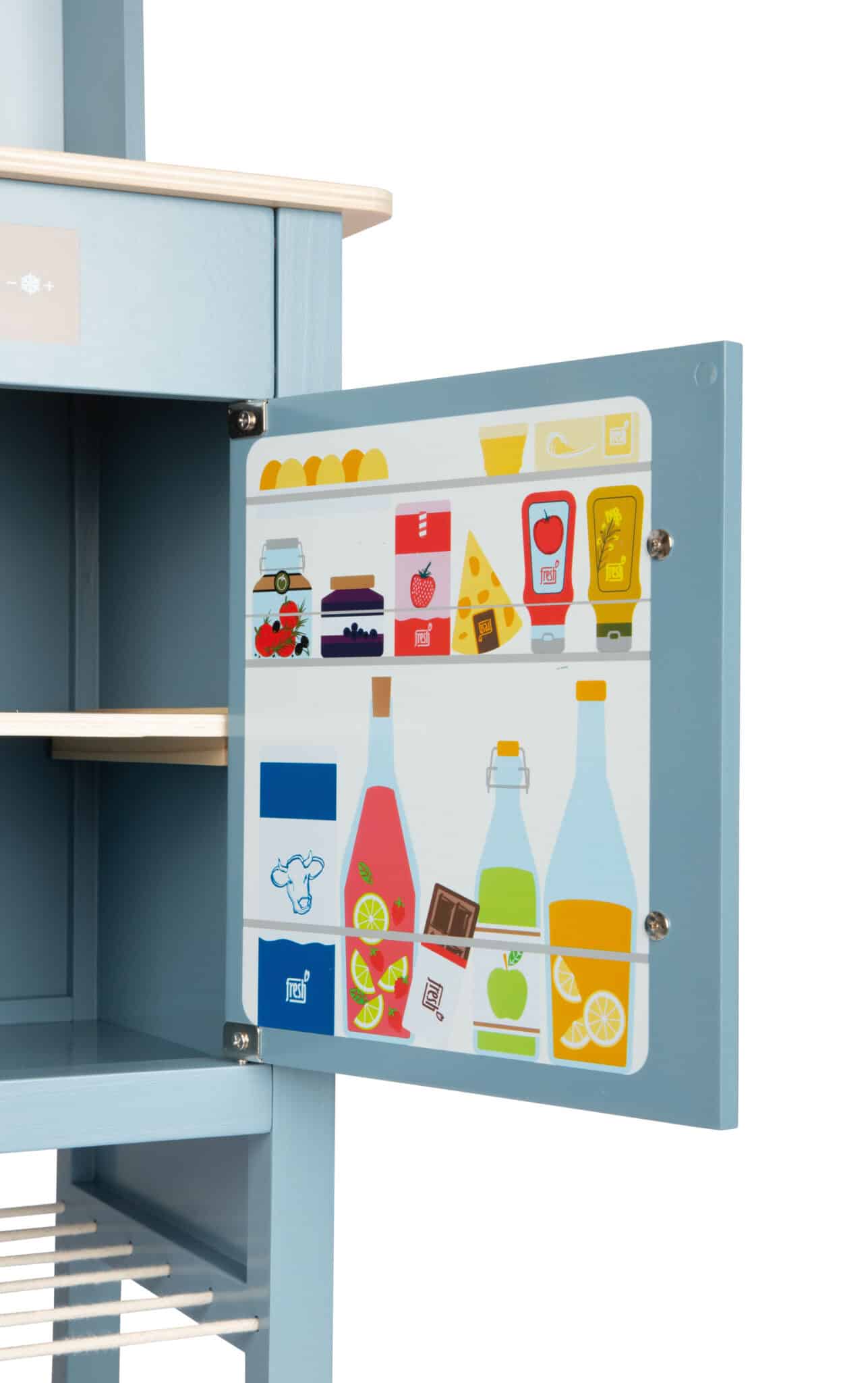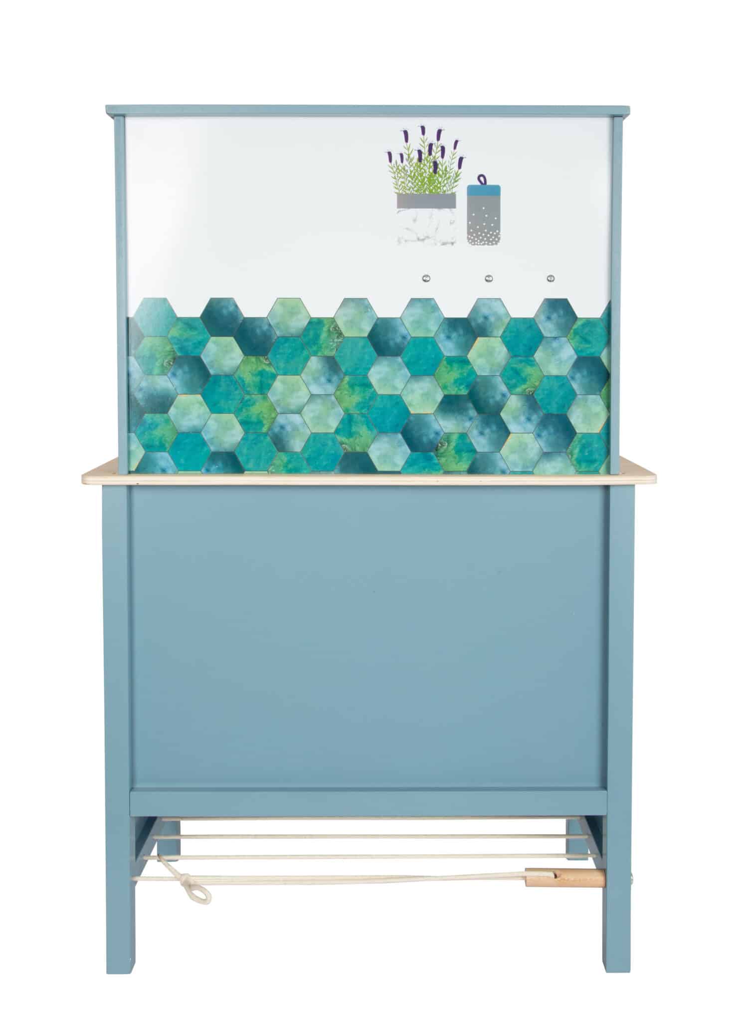 - Individuell anpassbar und detailverliebt: Die wendbare Rückwand bietet zwei Gestaltungsoptionen: eine moderne Fliesenoptik oder eine schlichte, einfarbig blaue Wand. Liebevoll bedruckte Flächen im Inneren von Kühlschrank und Backofen sorgen für zusätzlichen Realismus und laden zum Entdecken ein.