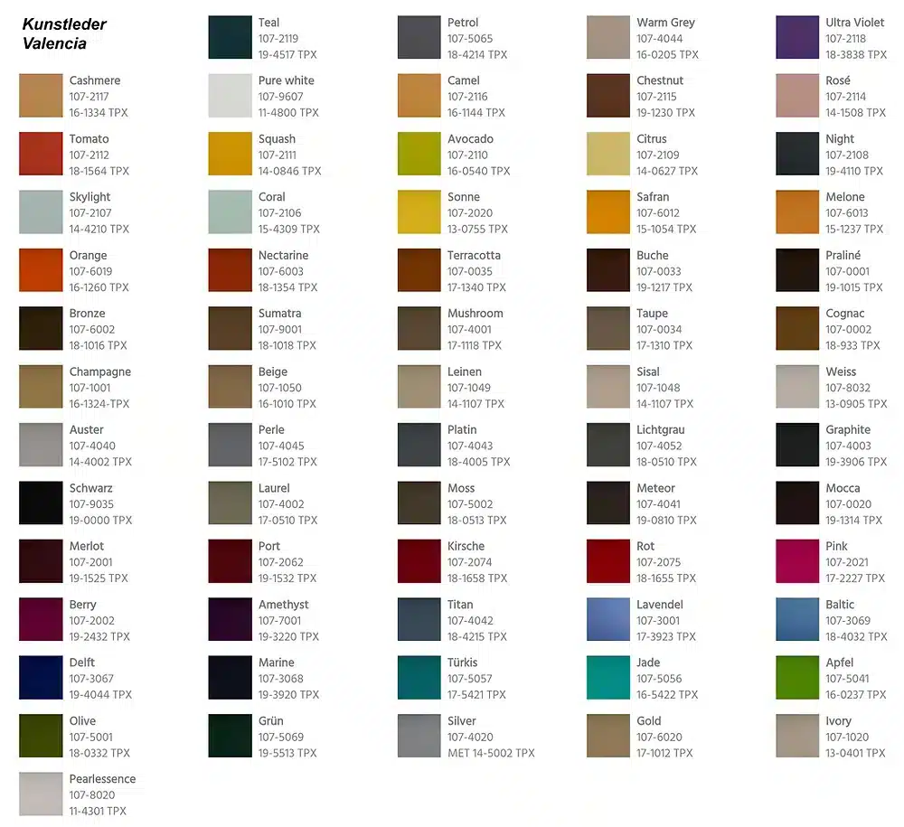 - Eigenschaften: Lederoptik, Antistatische Oberfläche, Wasserabweisend, Kältebruchresistent, sehr robuste und langlebige Oberfläche, Chemikalienbeständig, beständig gegen Sulfid-Flecken, Fleckenschutz-Oberfläche, Schimmelbeständige Trägerschicht und Oberfläche