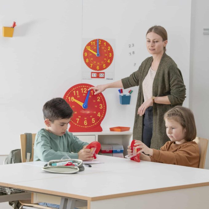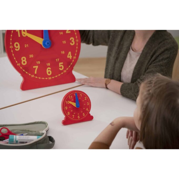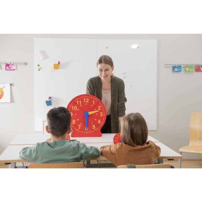 - Demonstrationsmaterial: Mit der großen Lehreruhr können Sie den Schülern die Uhrzeit und die entsprechenden Rechenschritte anschaulich erklären. Es wird einfach und verständlich dargestellt, wie man die Zeit abliest und wie sich verschiedene Zeitangaben zueinander verhalten.