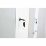 Kleiderschränke aus laminierter Spanplatte in Ahorn-Optik (18 mm) mit abschließbaren Türen in L-Form aus folierter MDF-Platte in weiß und grau. Je 2 Schlüssel pro Tür. In jedem Fach befindet sich ein Kleiderhaken. Das Untergestell ist aus stabilem Metall.