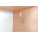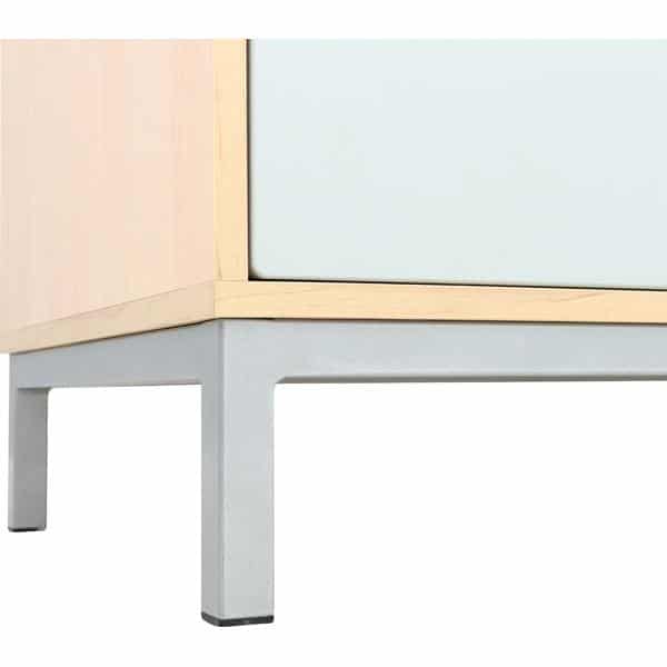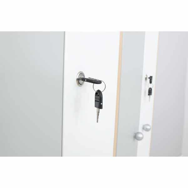 Kleiderschränke aus laminierter Spanplatte in Ahorn-Optik (18 mm) mit abschließbaren Türen in L-Form aus folierter MDF-Platte in weiß und grau. Je 2 Schlüssel pro Tür. In jedem Fach befindet sich ein Kleiderhaken. Das Untergestell ist aus stabilem Metall.
