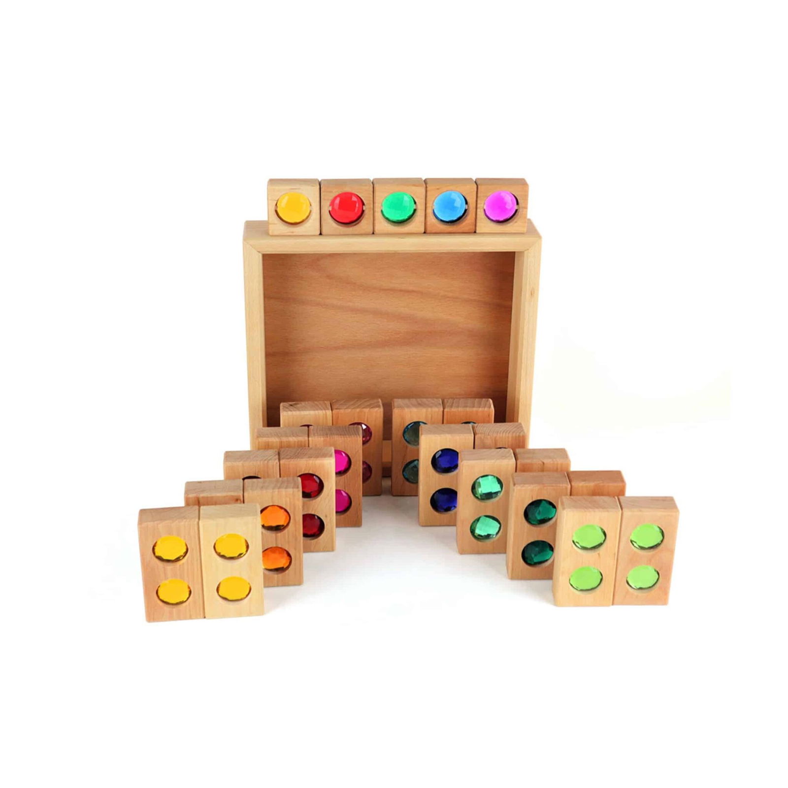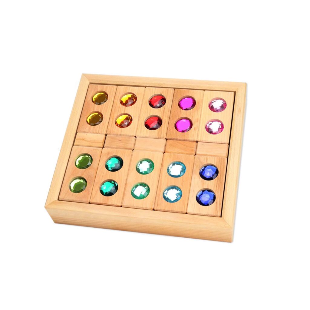 Das Set besteht aus 20 Quadern aus geöltem Erlenholz mit den Maßen 10 x 5 x 2,5 cm, die mit funkelnden Steinen versehen sind, sowie 5 Facettenklötzen (5 x 5 x 2,5 cm). Die verschiedenen Formen und Farben fördern das experimentelle Spielen und helfen Kindern, beim Bauen kreativ zu sein. Jeder Baustein ist liebevoll gestaltet und ermöglicht es den Kindern, mit Licht und Farben zu spielen, was ihre Fantasie anregen und die visuellen Sinne herausfordern wird.
