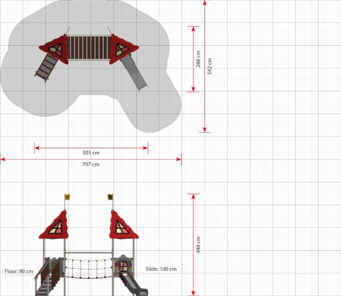 - Platzbedarf inkl. Sicherheitsabstände (LxB): 797 x 582 cm