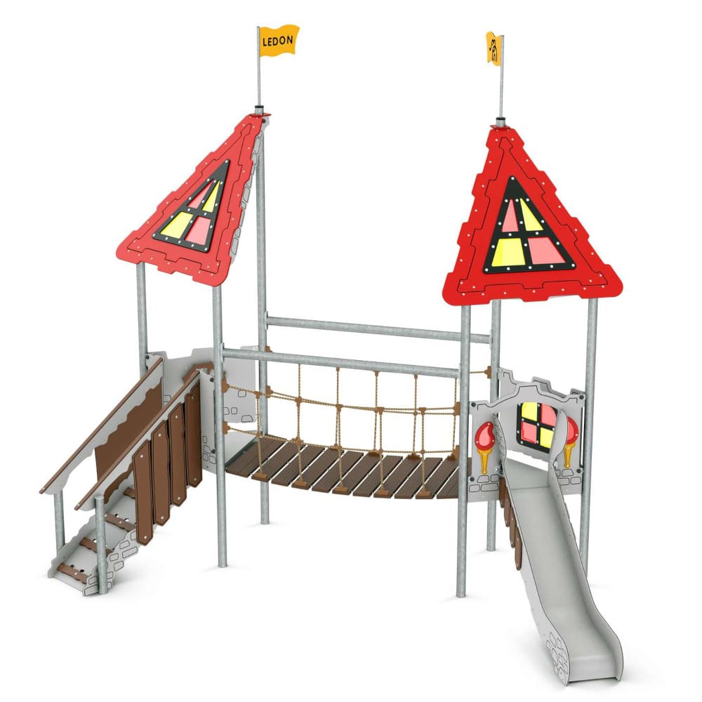 Der erste Turm ist mit einem drehbaren Steuerrad ausgestattet, das zu stundenlangem Spielen auf einem imaginären Ozean inspiriert. Wird das Steuerrad gedreht, rotiert auch das Schwert am Ritterschild auf der anderen Seite. Auf der schwingenden Hängebrücke, die zum nächsten Turm führt, können die Kinder „seefest“ werden. Im zweiten Turm angekommen, können sie durch ein buntes Fenster blicken und eine Rutsche hinabsausen, um wieder festen Boden unter die Füße zu bekommen. Beide Türme enthalten selbstverständlich die markanten bunten Dachfenster der LEDON Castle-Serie, die Muster auf den Boden projizieren und die Fantasie der Kinder anregen.