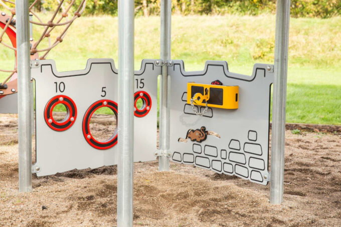 Der Spielplatz Troy bietet Spaß und Spiel auf zwei Ebenen. Oben im Turm befindet sich ein Steuerrad, das das Schwert in der Mitte des Ritterschilds auf der anderen Seite rotieren lässt, wenn man es dreht. Außerdem hat Troy einen Ausguck mit beweglichem Teleskop – beste Voraussetzungen also für stundenlange Rollenspiele. Auf Bodenhöhe befindet sich die Schatztruhenwand, die ebenfalls zu Rollenspielen animiert und beim Verschieben von Diamant und Ratte die Hand-Augen-Koordination trainiert. Außerdem gibt es eine Torwand, die das spielerische Erlernen von Zahlen und Koordination erleichtert.