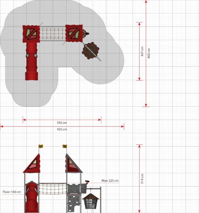 - Platzbedarf inkl. Sicherheitsabstände (LxB): 935 x 802 cm