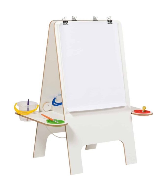 - Förderung motorischer Fähigkeiten: Die Staffelei unterstützt Kinder bei der Entwicklung ihrer Feinmotorik und stärkt die Hand-Auge-Koordination.