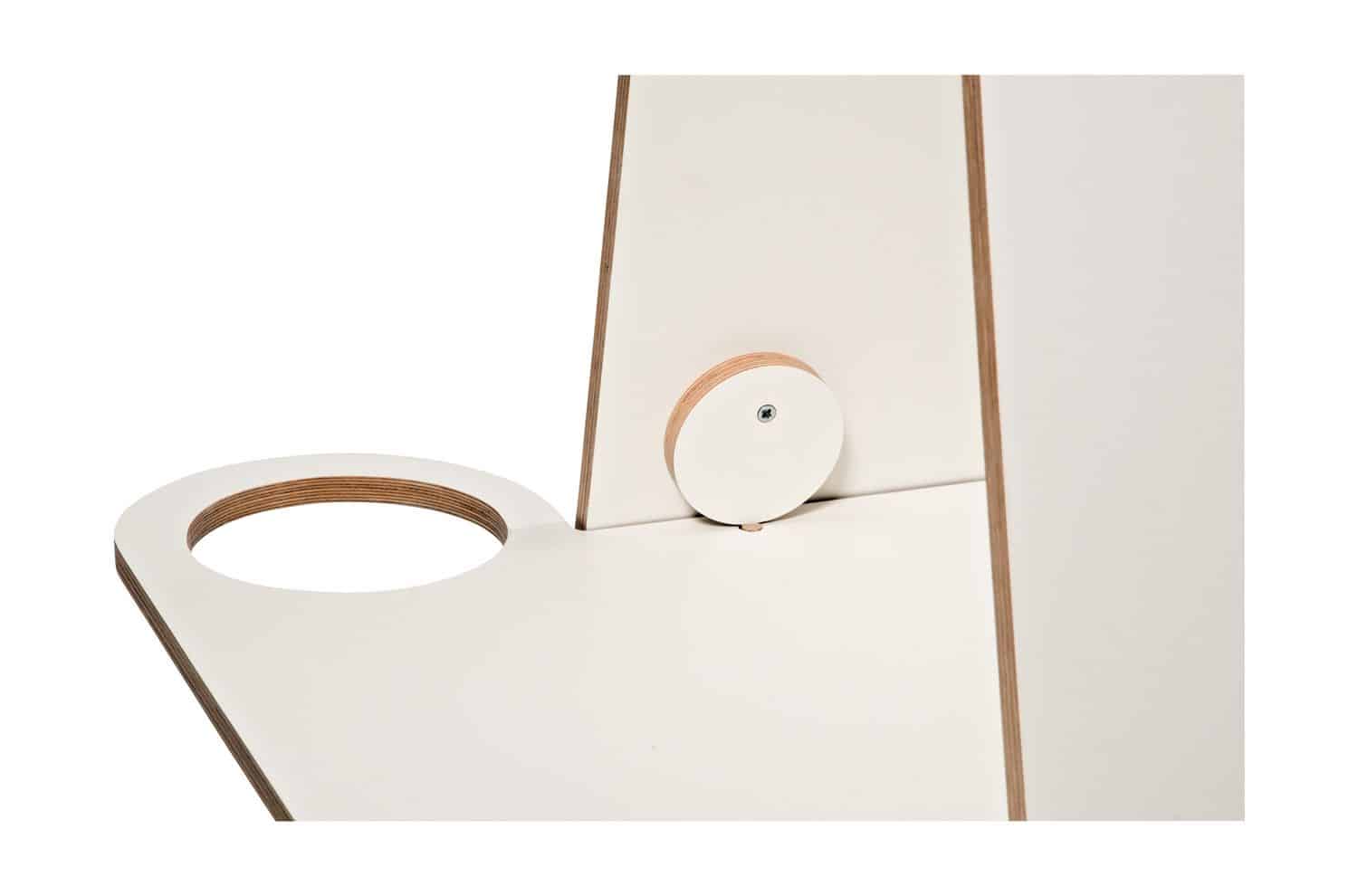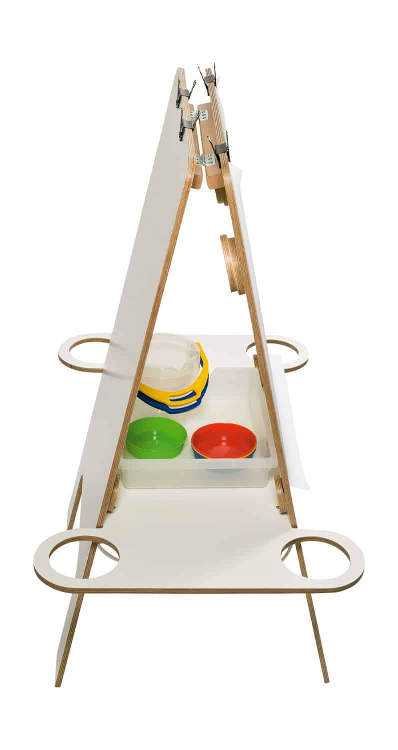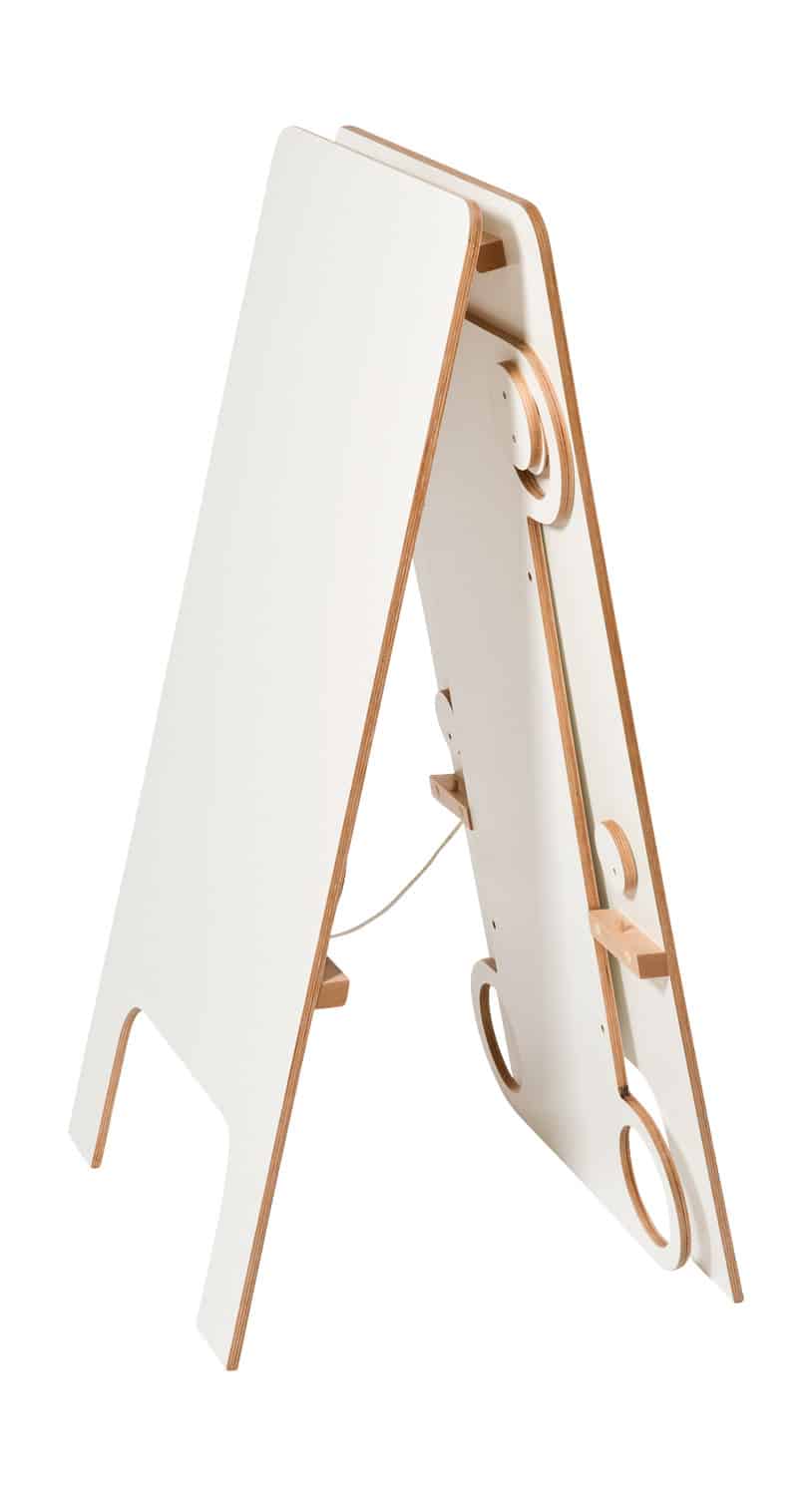 Die weiße Melaminbeschichtung sorgt für eine einfache Reinigung und ergänzt die hochwertige Verarbeitung aus Birke-Sperrholz und Buche. Eltern und Pädagogen schätzen die platzsparenden Eigenschaften der zusammenklappbaren Konstruktion, die auch nach intensiver Nutzung jahrelang verwendet werden kann.