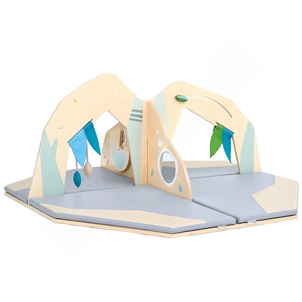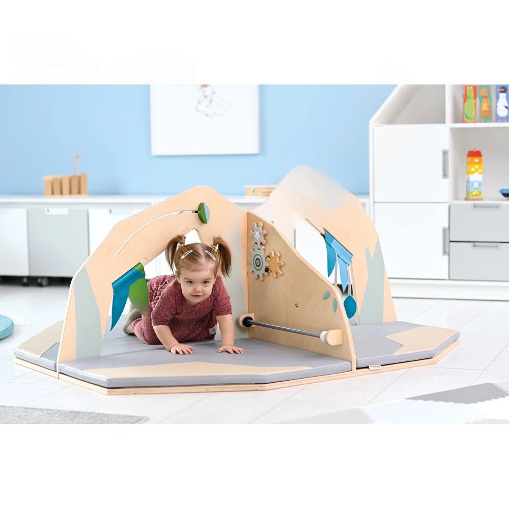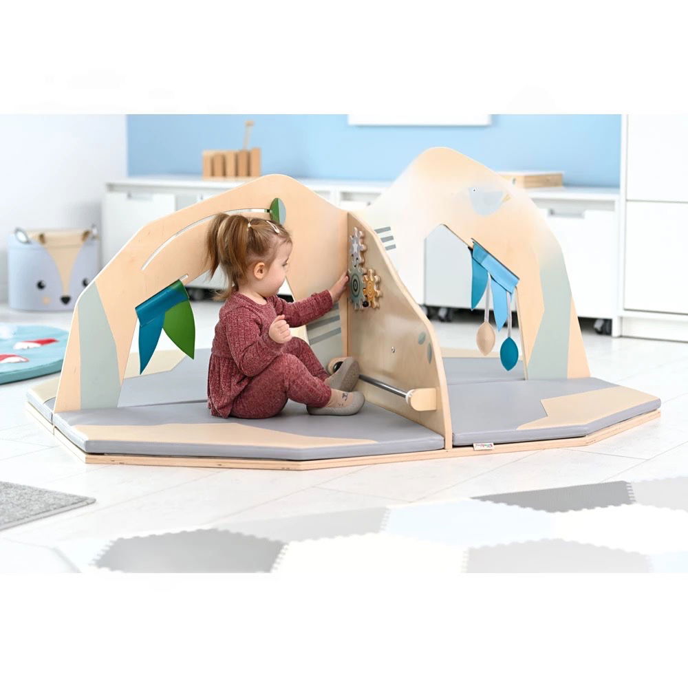 Schaffen Sie einen Ort des Staunens und Entdeckens mit der Kleinkindspielecke Bergwiese. Diese zauberhafte Spiellandschaft ist speziell für Krabbelkinder und Kleinkinder ab 18 Monaten konzipiert und entführt sie in eine freundliche Gebirgswelt voller sensorischer Reize. Umgeben von liebevoll gestalteten Bergmotiven, bietet diese von allen Seiten zugängliche Oase einen sicheren und anregenden Rahmen für die ersten großen Abenteuer. Die weich gepolsterte Matte im Inneren lädt zum Verweilen, Krabbeln und Spielen ein, während die vier Wände unzählige Möglichkeiten zum Fühlen, Hören, Sehen und Greifen bereithalten.