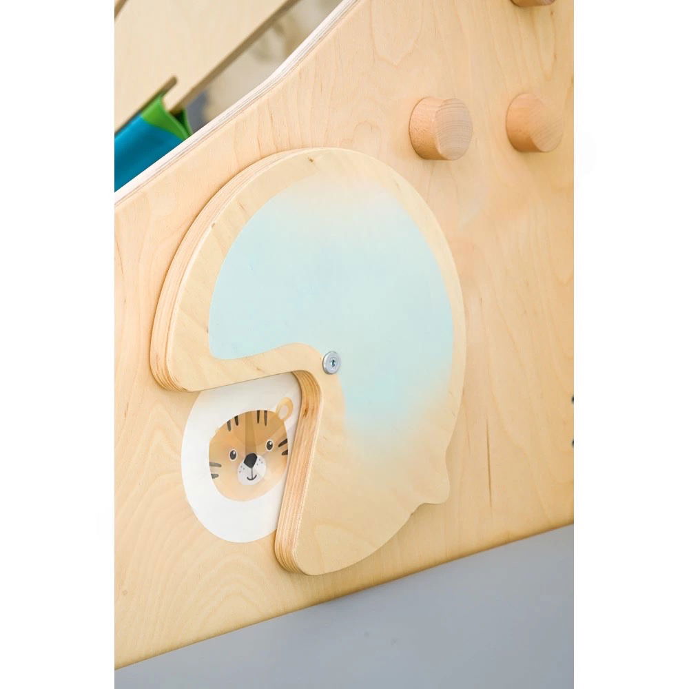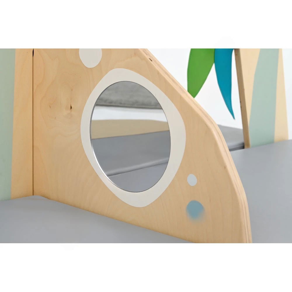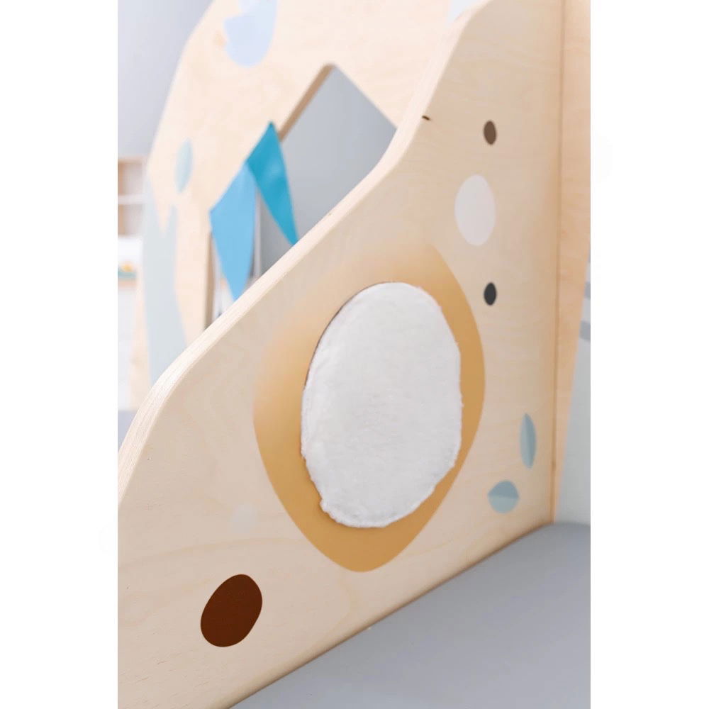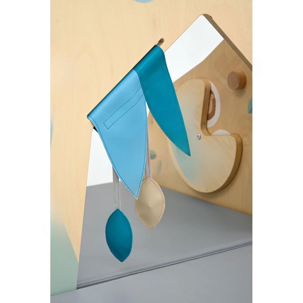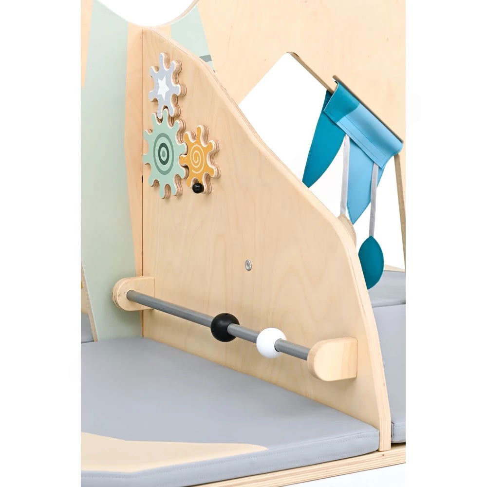 Die Bergwiese ist ein Fest für die Sinne. An den Wänden finden sich zahlreiche Elemente, die zum Entdecken einladen: ein bruchsicherer Acrylspiegel für die Selbstwahrnehmung, flauschige Plüsch-Applikationen zum Fühlen, spannende Schiebespiele und ineinandergreifende Zahnräder zum Ausprobieren. - Gezielte Förderung der Motorik