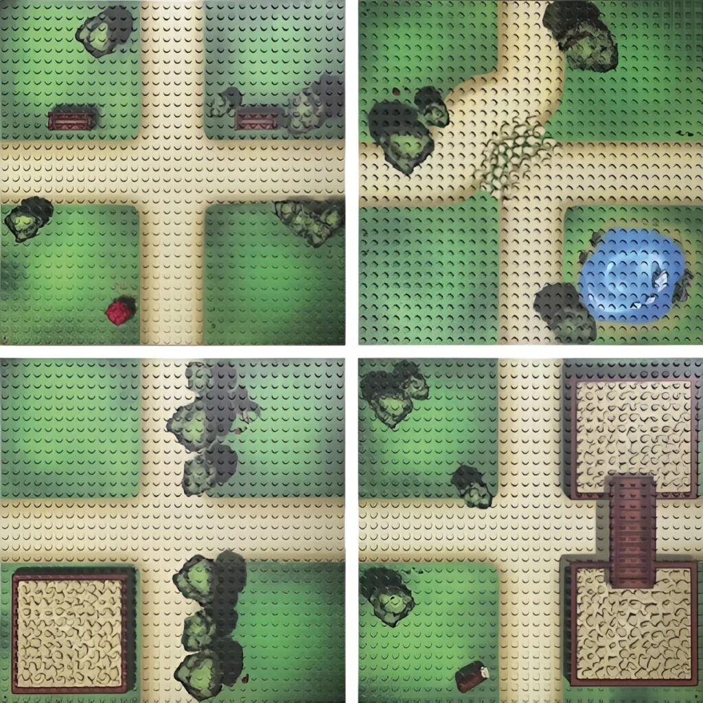 - Große, zusammenhängende Welt: Die vier Platten können zu einer großen Landschaft von 64 x 64 Noppen kombiniert werden, die ausreichend Platz für weitläufige Bauernhöfe, Koppeln und Gebäude bietet.
