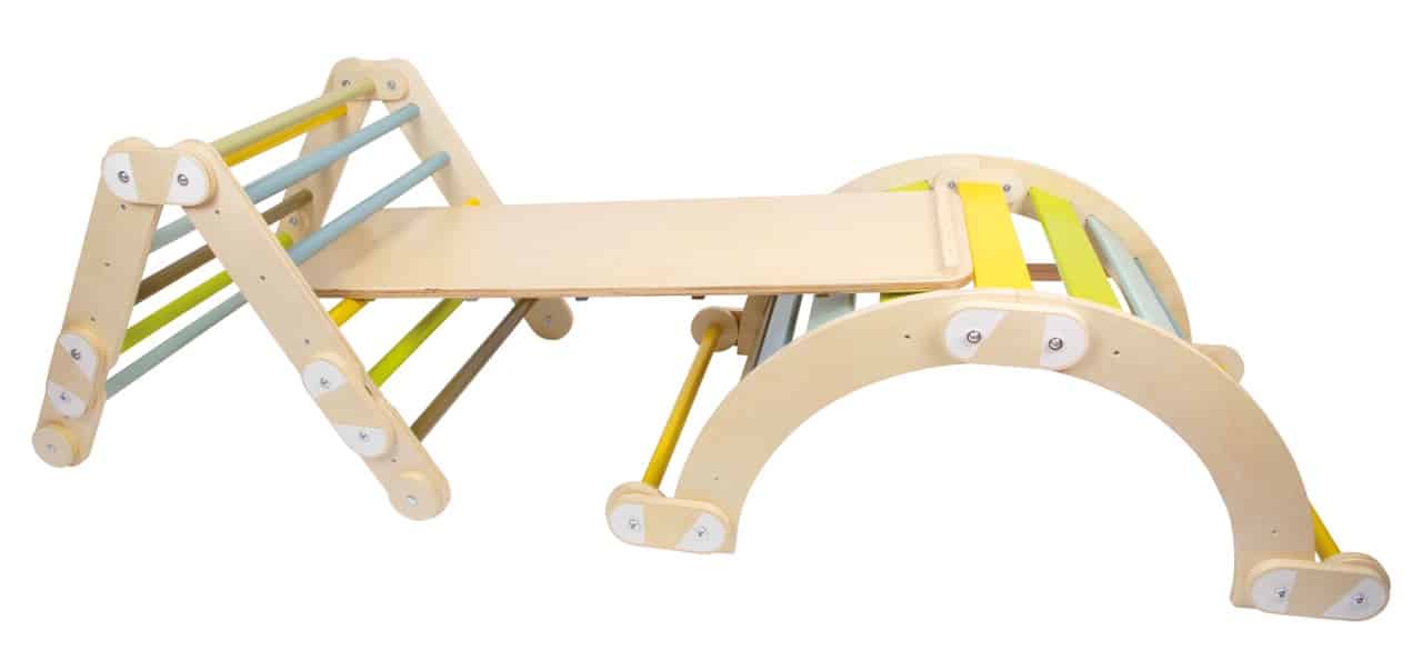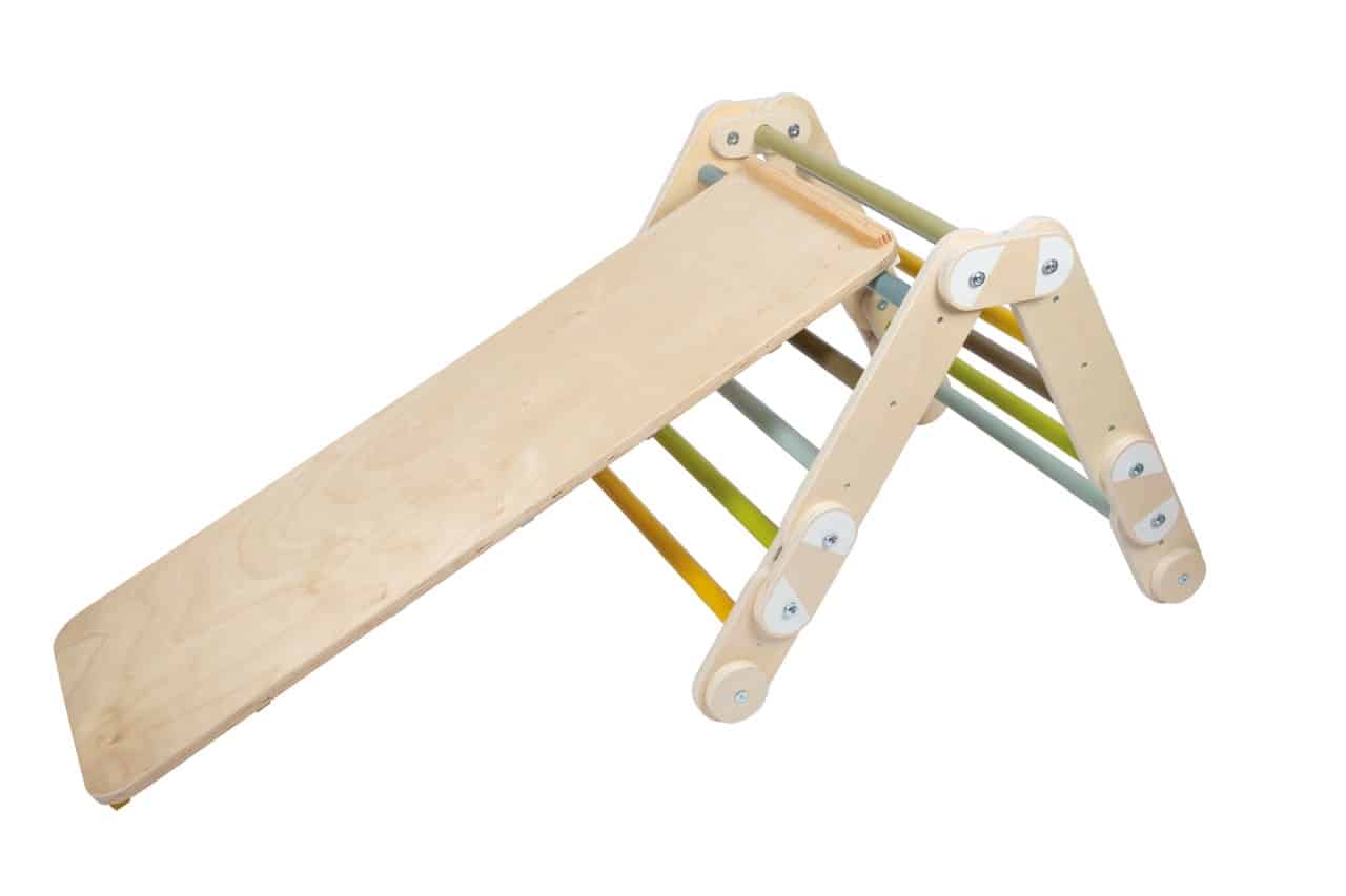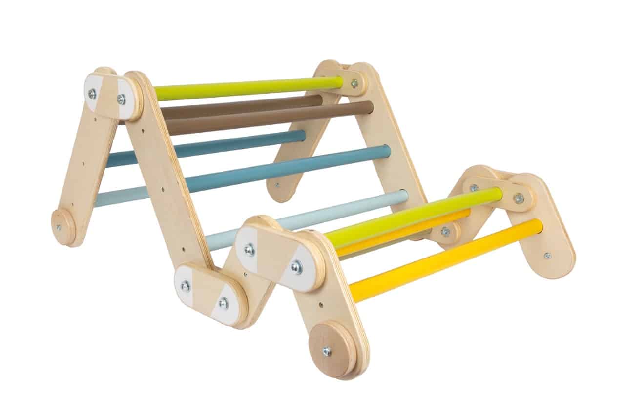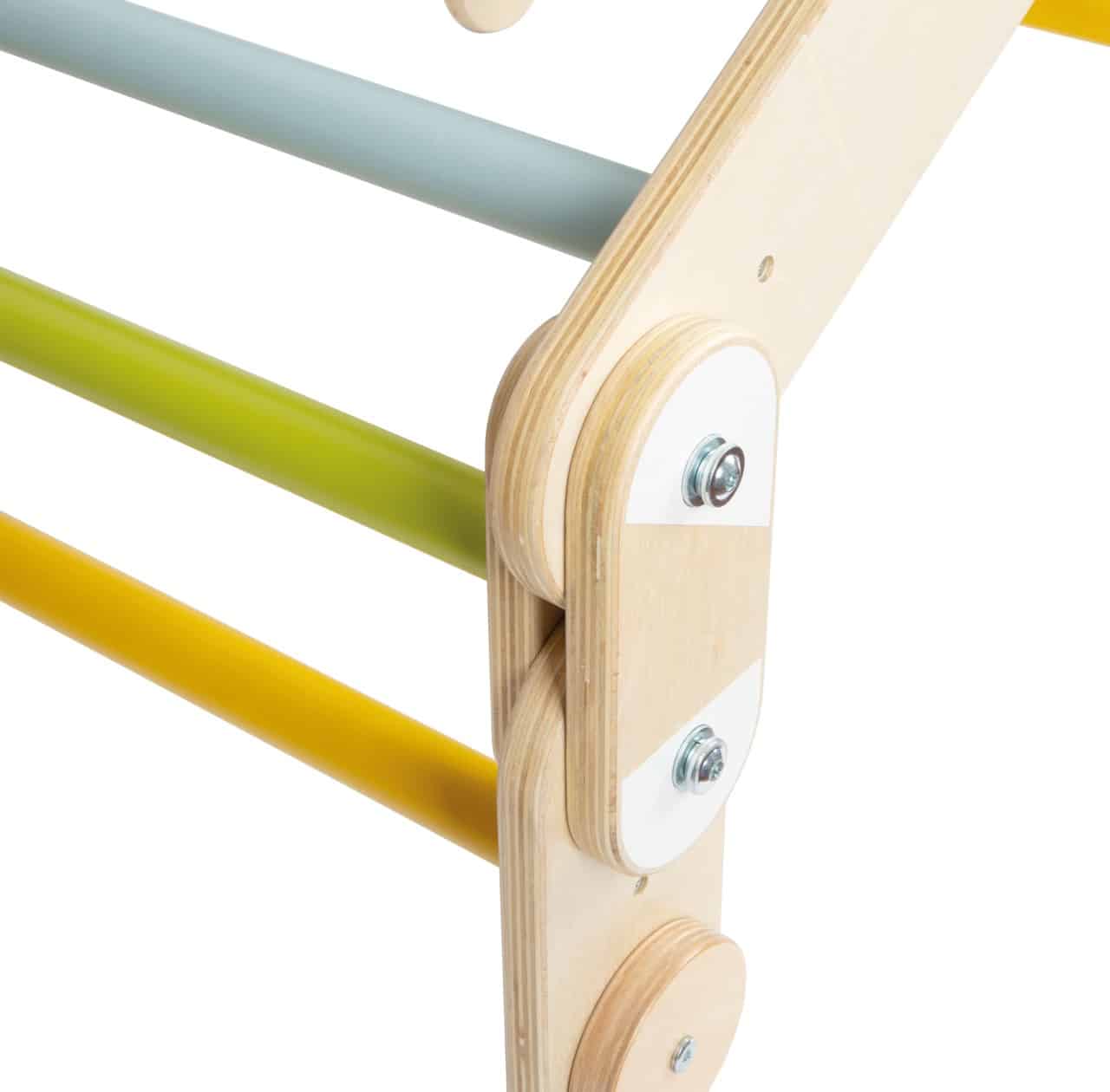 - Stilvolles Design für moderne Wohnräume: Die Kombination aus klaren Linien, modernen Farben und einem hohen Anteil an sichtbarem Naturholz macht das Kletterdreieck zu einem ästhetischen Möbelstück. Es fügt sich harmonisch in jedes Kinder- oder Wohnzimmer ein, ohne wie ein Fremdkörper zu wirken.