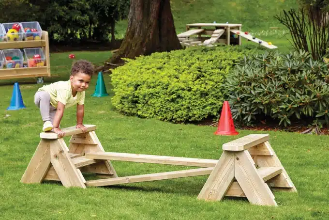 Gerade im Kleinkindalter sind Balancieren und Klettern fundamentale Entwicklungsschritte.- Gleichgewichtsschulung: Das Gehen über die schmalen Bohlen erfordert Konzentration und Körperspannung. Kinder lernen, ihren Schwerpunkt zu kontrollieren.