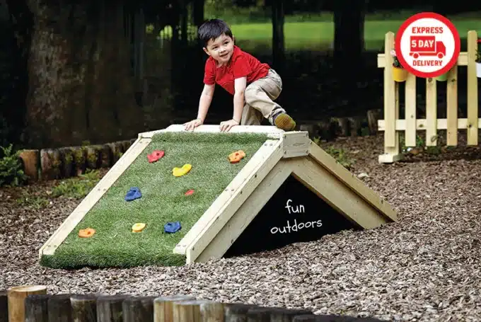 Doch damit nicht genug: Die Seiten des Dreiecks verbergen weitere Überraschungen. Ein großer, kindersicherer Spiegel lädt zur Selbstwahrnehmung und zu lustigen Grimassen ein, während eine integrierte Kreidetafel auf der gegenüberliegenden Seite kreativen Kunstwerken einen Raum gibt. Gefertigt aus erstklassigem, wetterfestem Rotholz, ist dieses Klettergerüst eine sichere, langlebige und pädagogisch wertvolle Bereicherung für jeden Außenbereich in Kitas, Schulen oder im heimischen Garten.