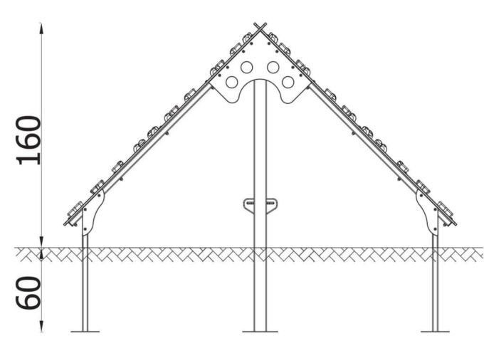 • Material: Konstruktion aus Vierkantprofilen 90×90 mm und 40×40 mm direkt im Boden befestigt. Dach aus Polyethylen-HDPE-Platten. Alle Fittings und Anschlüsse sind witterungs- und UV-beständig. Stahlelemente werden mit Zinkgrundierung und Pulverlackierung gegen Korrosion geschützt.