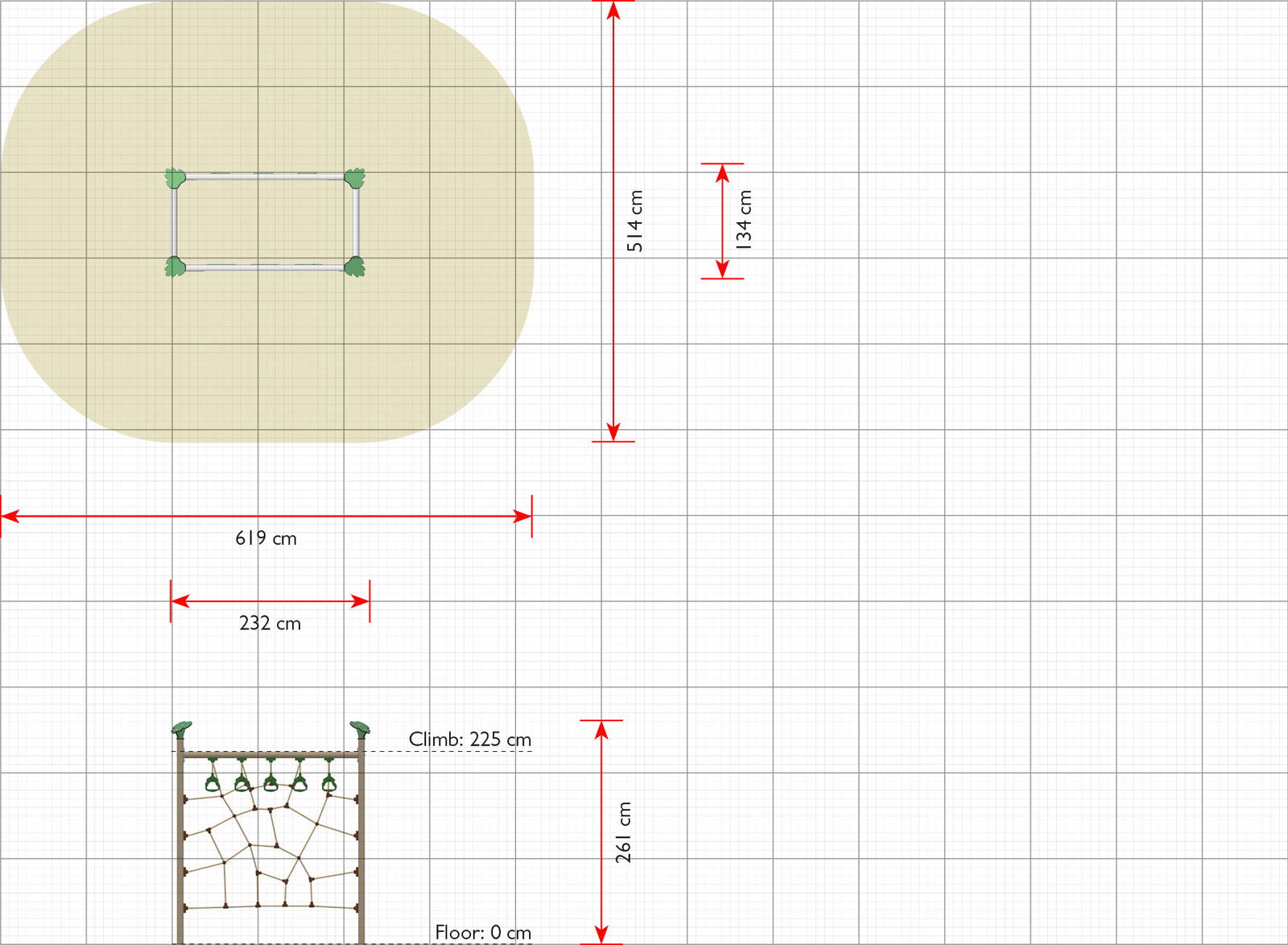 - Platzbedarf inkl. Sicherheitsabstände (LxB): 619 x 514 cm