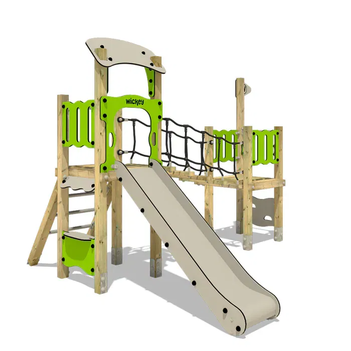 Der Wickey PRO MAGIC Fame bietet den Kindern die Möglichkeit, ihre motorischen Fähigkeiten auszubauen und ihre Fantasie zu entfalten. Mit zwei Spielpodesten in Höhen von 90 cm und 120 cm, einer hochwertigen HDPE-Rutsche, einer schrägen Kletterleiter mit Edelstahlsprossen sowie einer Kletterwand aus HDPE sind die Herausforderungen und Erlebnisse nahezu unbegrenzt.