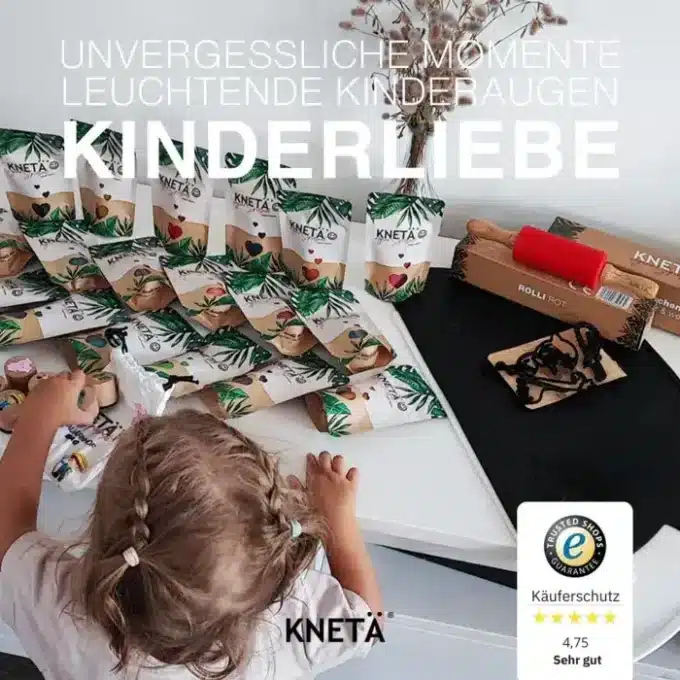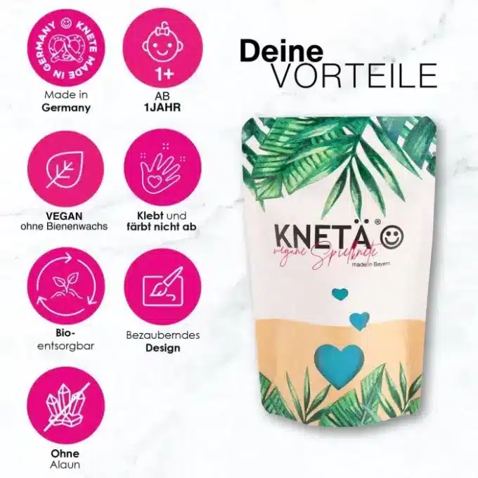 Hergestellt in Bayern, steht KNETÄ® für höchste Qualität und Liebe zum Detail. Die Knete ist frei von Alaun und bietet ein bedenkenloses Spielvergnügen für Kinder. Nachhaltige Materialien und eine umweltfreundliche Entsorgungsmöglichkeit in der Biotonne unterstreichen unser Engagement für eine bessere Welt.