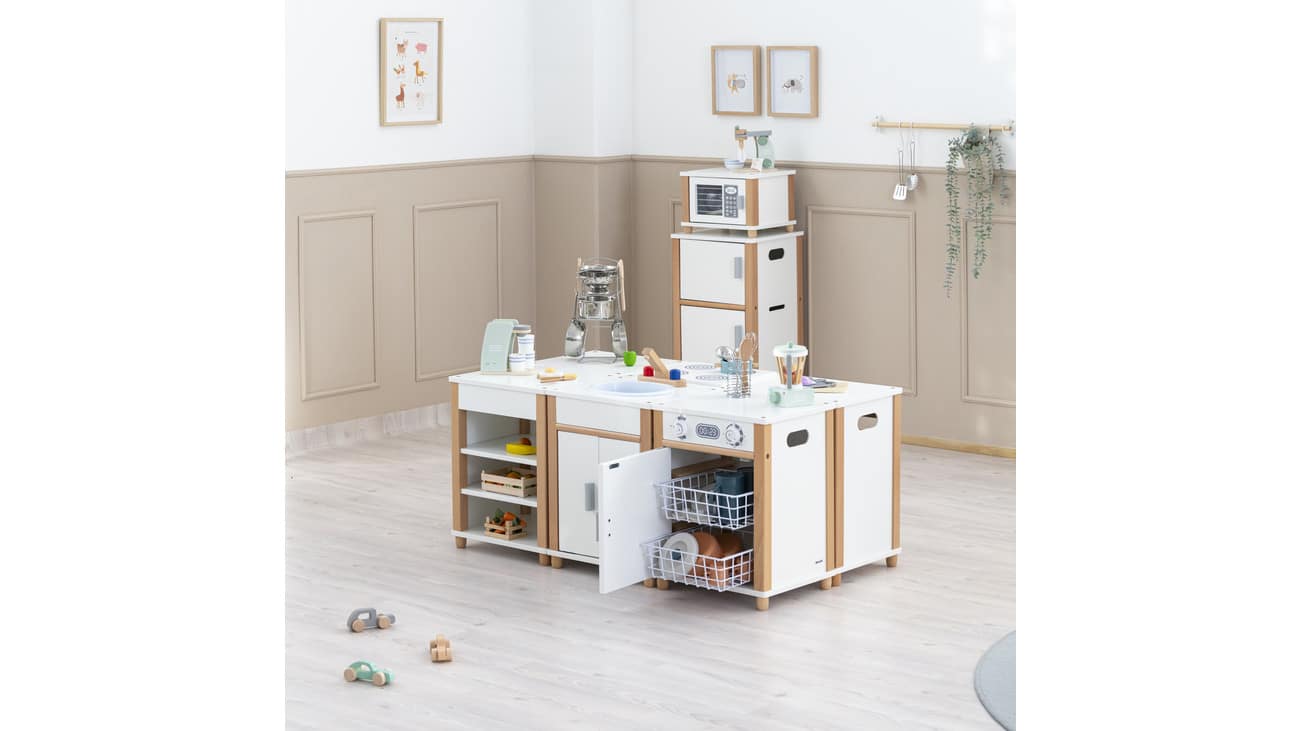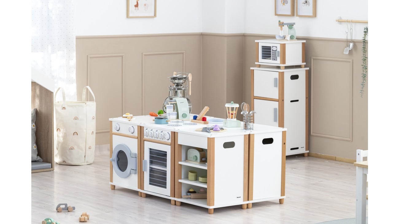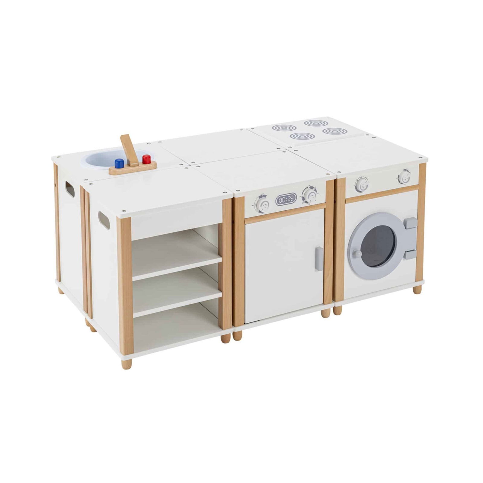 Die Kochinsel besteht aus einem Herd mit Backofen, einem Spülbecken, einer Spülmaschine, einer Waschmaschine und zwei Küchenregalen. Diese umfangreiche Ausstattung ermöglicht es Kindern, die alltäglichen Handlungen der Erwachsenen nachzuahmen – vom Kochen und Backen bis hin zum Geschirrspülen und Wäschewaschen.