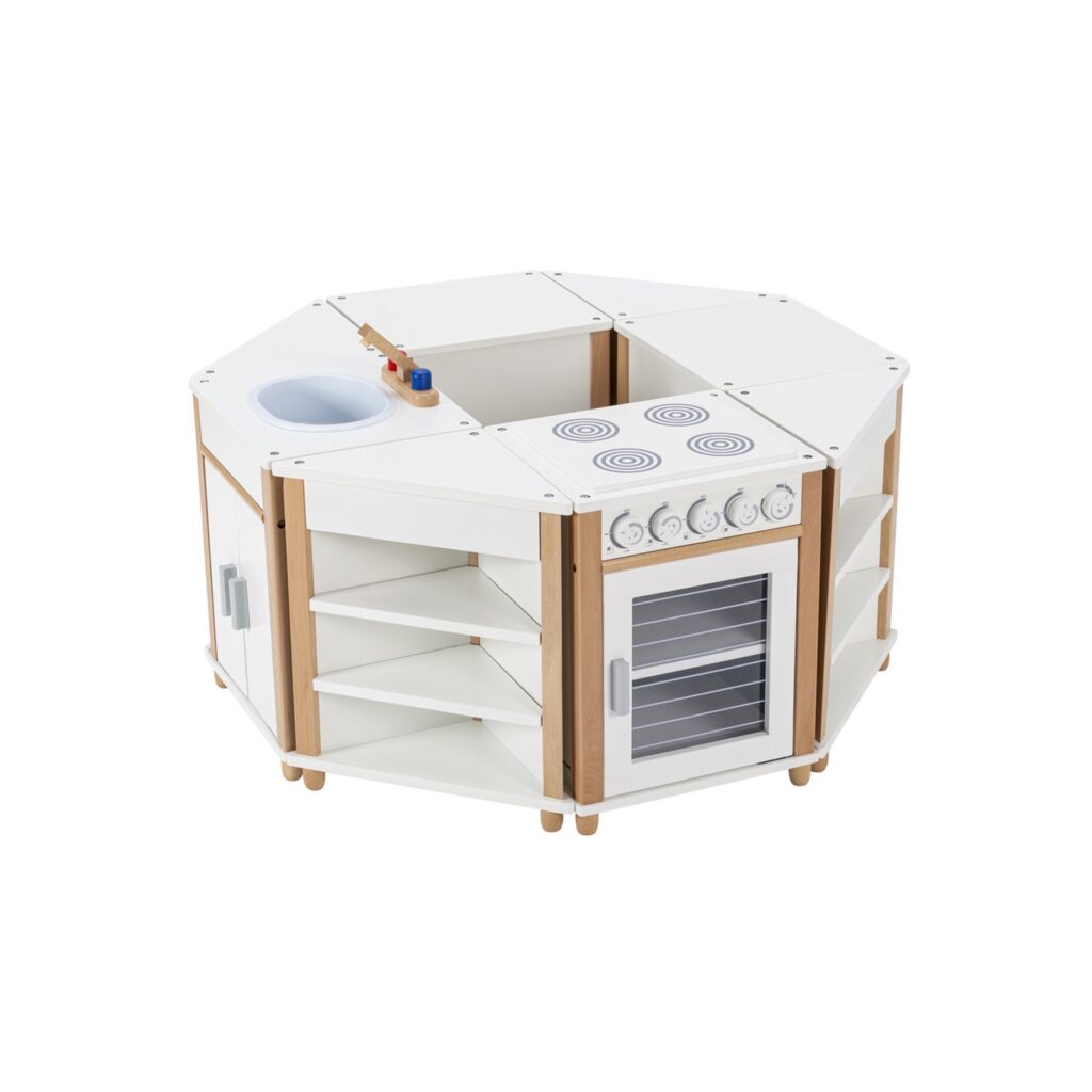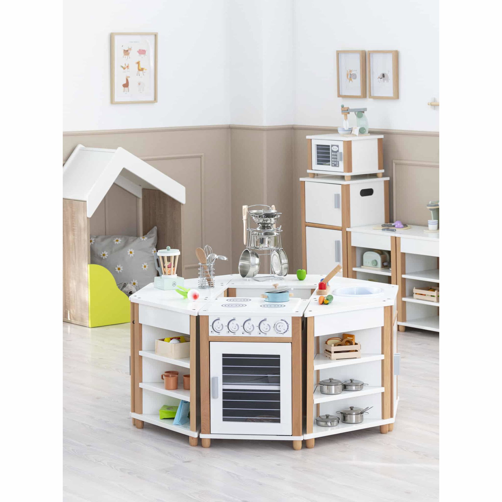 Die 4 dreieckigen Küchenregale bieten nicht nur reichlich Stauraum für Spielgeschirr und Zubehör, sondern ermöglichen auch die einfache Gestaltung einer stabilen Kücheninsel. Diese lädt ein zu gemeinsamen Koch- und Backaktivitäten und fördert das kreative Spielen in Gruppen – ideal für die Entwicklung von Teamgeist und Kommunikation.