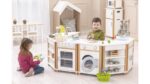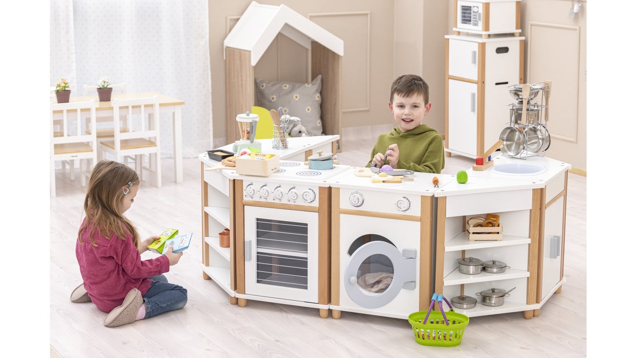 Mit insgesamt 8 hochwertigen Elementen – darunter Herd mit Backofen, Spülbecken, Spülmaschine, Waschmaschine und 4 stabile Küchenregale – sind der Kreativität keine Grenzen gesetzt. Kinder können spielerisch die Tätigkeiten von Erwachsenen nachahmen, sei es beim Kochen, Backen, Spülen oder Aufräumen. Durch das Nachspielen erlernen sie nicht nur alltägliche Handgriffe, sondern trainieren auch spielerisch ihre Feinmotorik und sozialen Fähigkeiten.