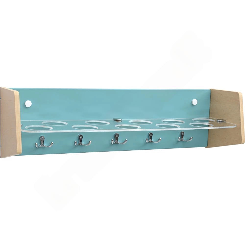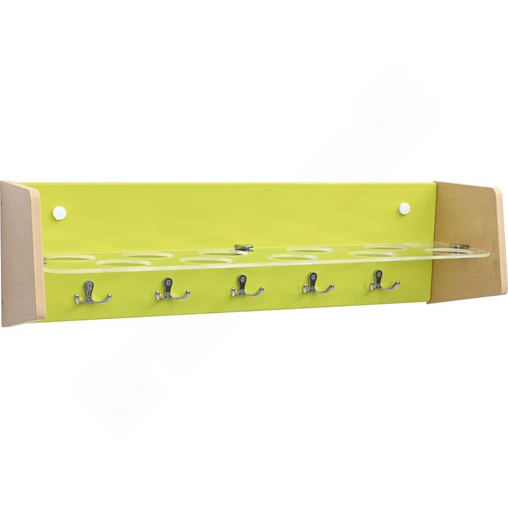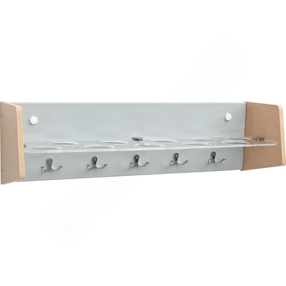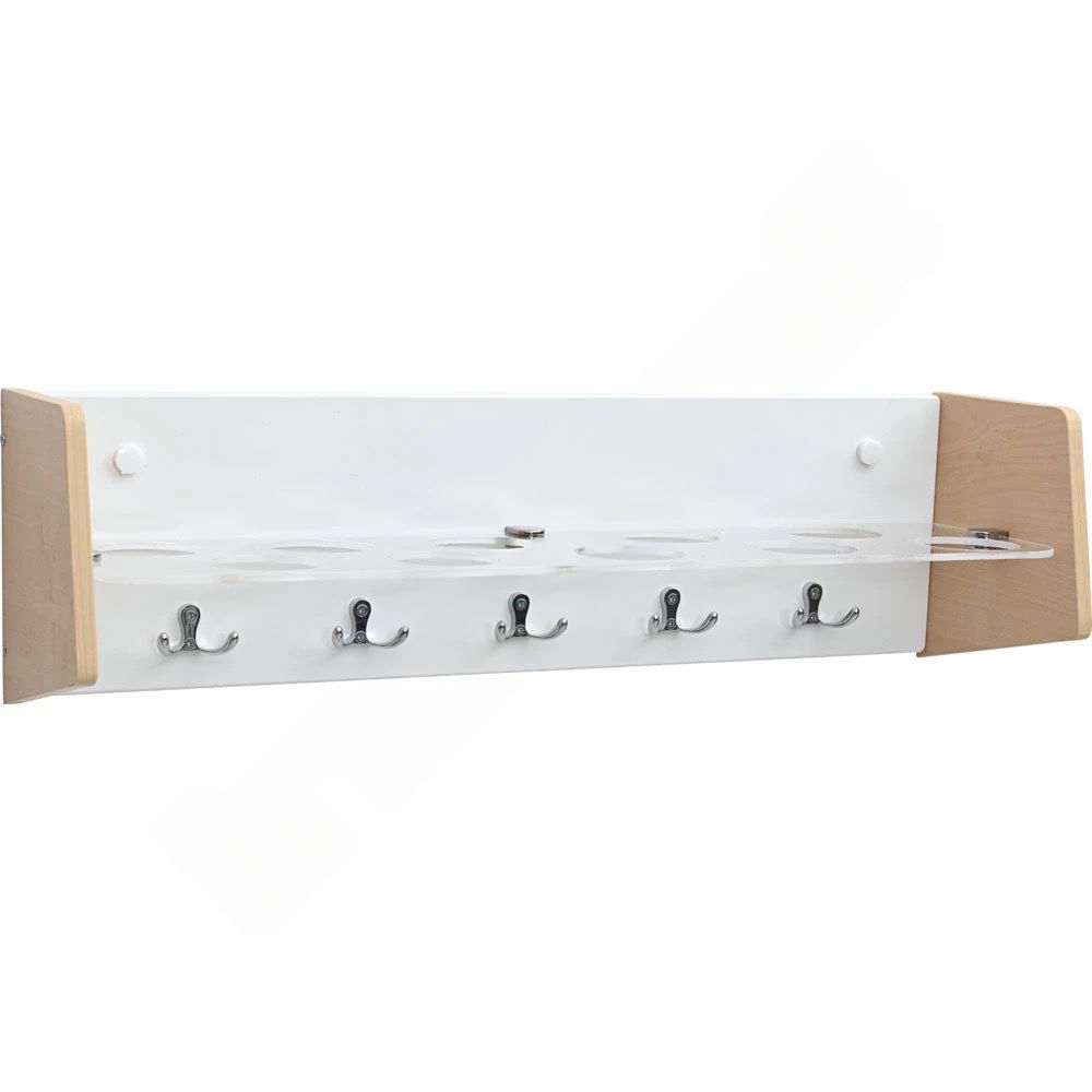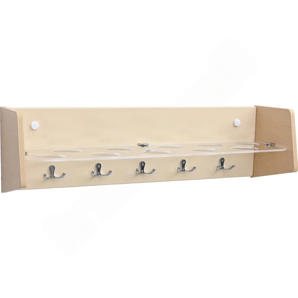 Unter der Becherleiste befinden sich fünf robuste Doppelhaken. Das bedeutet, es gibt insgesamt zehn Aufhängemöglichkeiten. Jedes Kind kann seinem Becherplatz direkt einen Haken für sein Handtuch zuordnen. Diese klare 1:1-Zuordnung verhindert Verwechslungen und unterstützt die Kinder dabei, Verantwortung für ihre persönlichen Sachen zu übernehmen. - Robuste und pflegeleichte Materialien