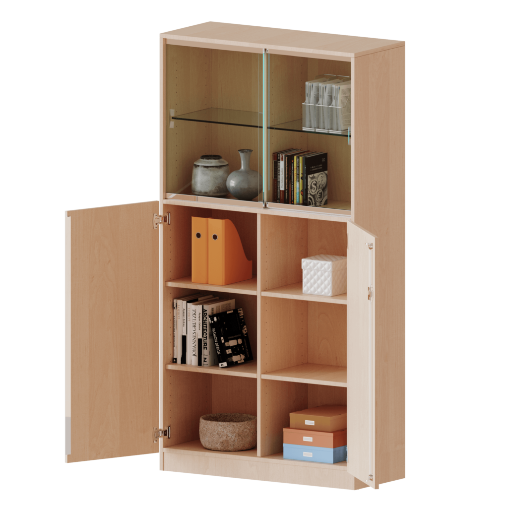 Der Kombischrank der Serie evo180 ist die ideale Lösung für alle, die eine intelligente Verbindung aus geschütztem Stauraum und stilvoller Präsentation suchen. Dieses Möbelstück vereint auf fünf Ordnerhöhen das Beste aus zwei Welten: einen großzügigen, abschließbaren Bereich mit Drehtüren unten und eine elegante Vitrine mit Glasschiebetüren oben. Ob im Lehrerzimmer, im Büro, im Konferenzraum oder als hochwertiger Klassenraumschrank – dieses Multitalent schafft nicht nur Ordnung, sondern auch eine professionelle und ansprechende Atmosphäre. Dank der durchdachten Konstruktion, der hochwertigen Materialien und der Möglichkeit, den Schrank auch als Raumteiler zu nutzen, passt er sich flexibel an jede moderne Lern- und Arbeitsumgebung an.
