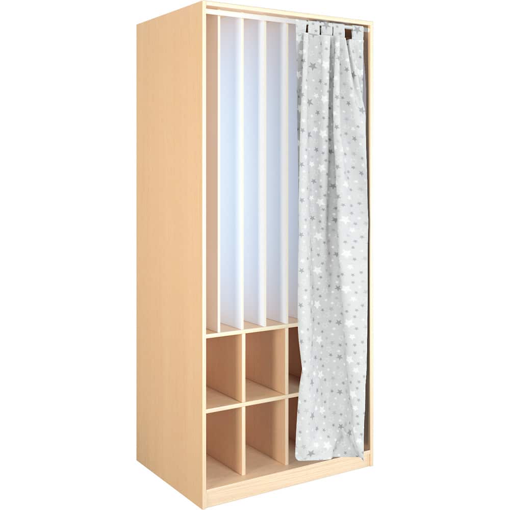 Kombischrank für 8 Matten und Decken – Praktisch und charmant in Birke-Optik: Unser Kombischrank für 8 Matten und Decken bietet nicht nur funktionalen Stauraum, sondern auch ein bezauberndes Design mit Sternchen-Vorhang. Dieser hochwertige Schrank ist ideal für Schulen und Kindergärten und sorgt für Ordnung und Übersicht.