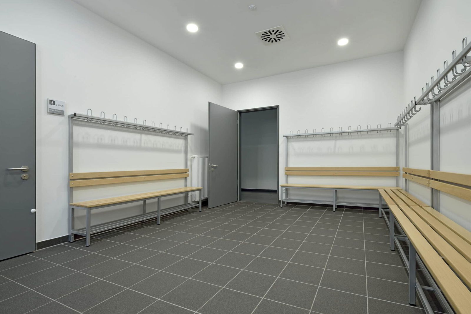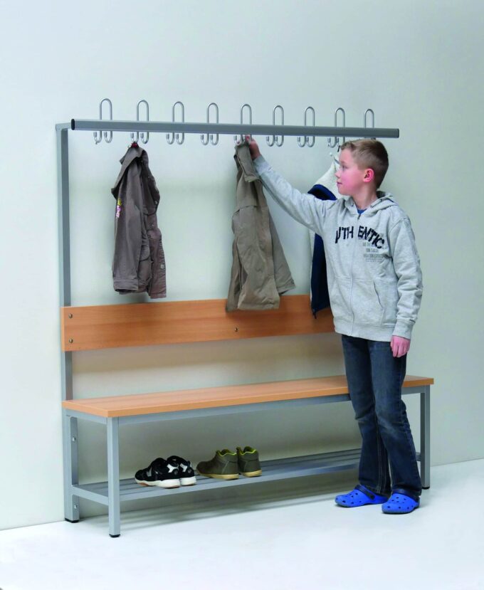 An der Sicherheitshakenleiste der Garderobe können Jacken, Mützen, Rucksäcke und vieles mehr aufgehängt werden. Ebenso können Schuhe auf dem eingebauten Stahlrost ordentlich abgestellt werden