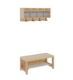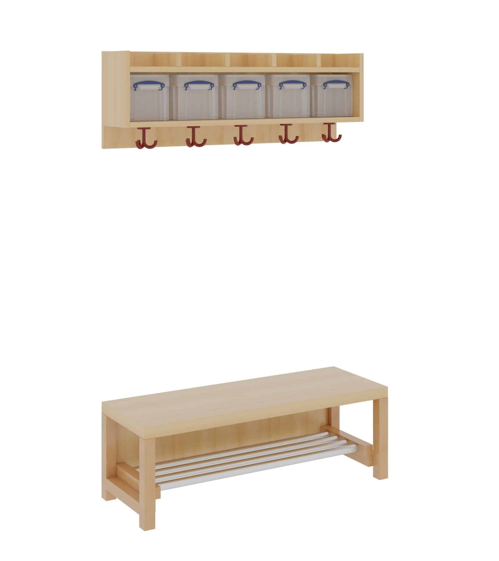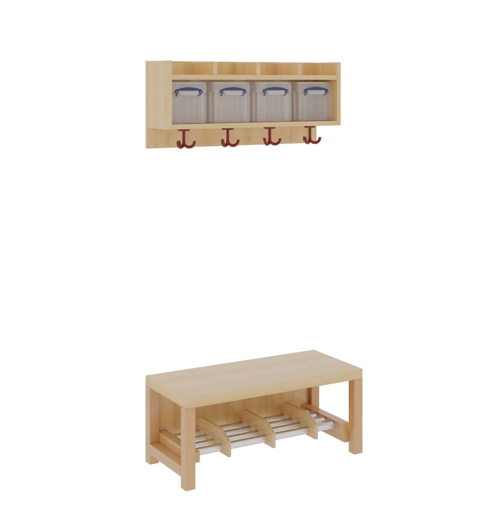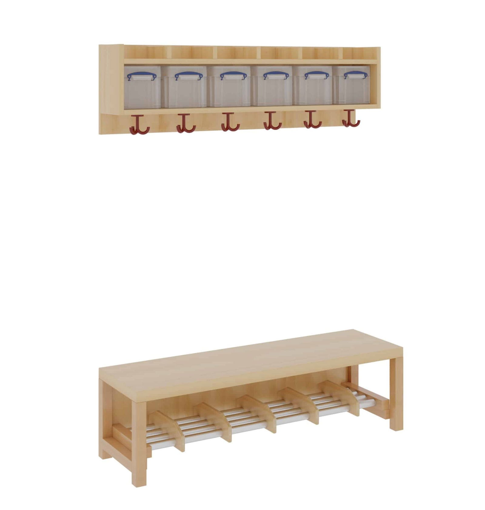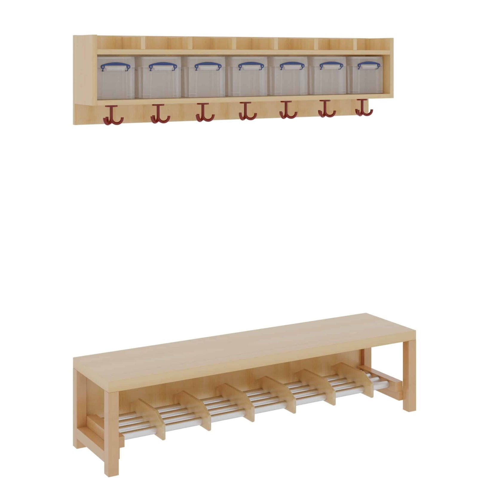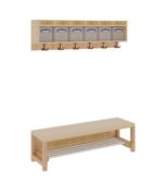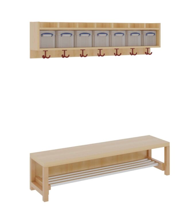 Unsere Komplettgarderobe mit einfacher Ablagereihe bietet viel Platz zur sorgfältigen Aufbewahrung von Jacken, Schuhen, Rucksäcken und vielem mehr. Durch den Einsatz von Massivholzstollen in Stütze und Bank ist diese besonders robust und langlebig, wodurch sie auch spielenden Kindern standhält. Die Garderobe eignet sich daher ideal für den Einsatz in Krippe, Hort oder Kita. In den mitgelieferten Boxen für die Ablagereihe können Gegenstände sicher und organisiert verstaut werden, wodurch keine Gegenstände verloren gehen oder unter den Kindern vertauscht werden können. Diese Variante beinhaltet zudem einen Aluminiumrost zur Schuhablage. Die Ablagereihe wird bei diesem Produkt separat an der Wand montiert. Die Kinder Garderobe ist Ihren Anforderungen entsprechend hinsichtlich Sitzhöhe (26cm/34cm/42cm), Hakenfarbe und Platzanzahl (4/5/6/7) konfigurierbar.