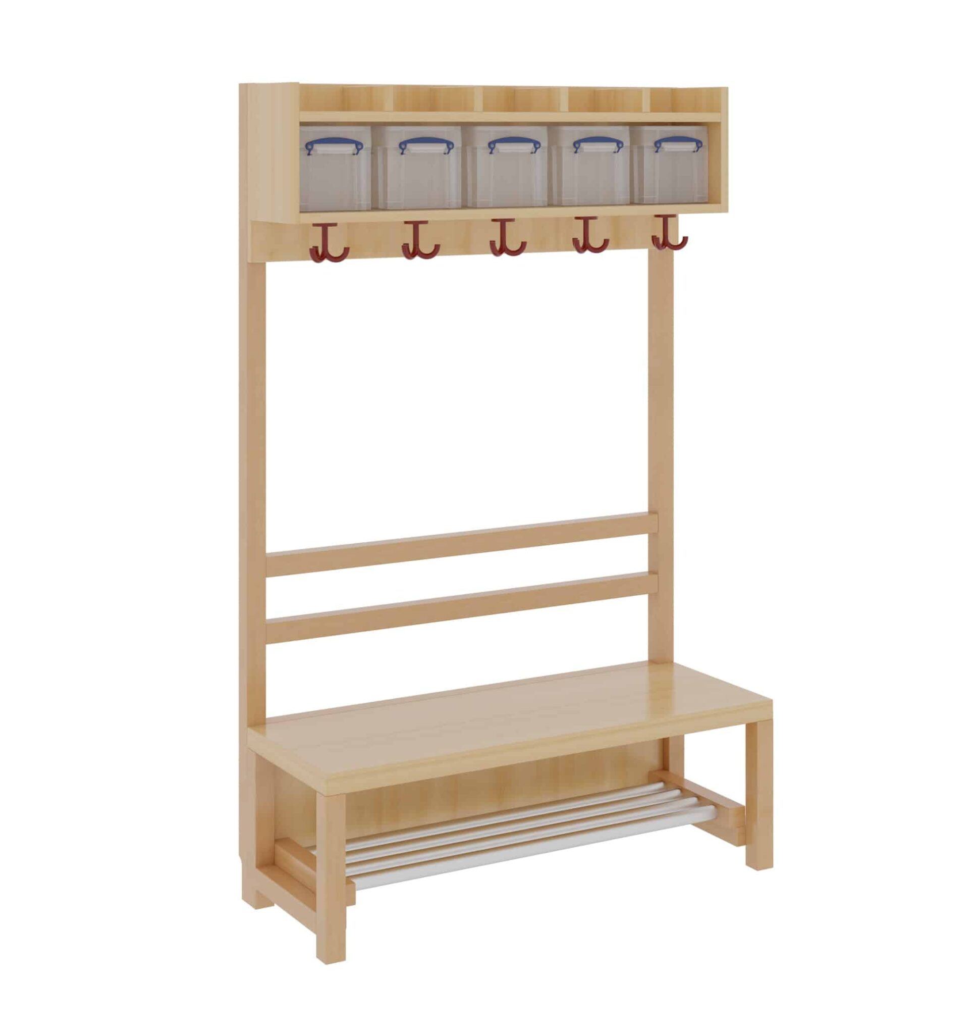 Unsere Komplettgarderobe mit einfacher Ablagereihe bietet viel Platz zur sorgfältigen Aufbewahrung von Jacken, Schuhen, Rucksäcken und vielem mehr. Durch den Einsatz von Massivholzstollen in Stütze und Bank ist diese besonders robust und langlebig, wodurch sie auch spielenden Kindern standhält. Die Garderobe eignet sich daher ideal für den Einsatz in Krippe, Hort oder Kita. In den mitgelieferten Boxen für die Ablagereihe können Gegenstände sicher und organisiert verstaut werden, wodurch keine Gegenstände verloren gehen oder unter den Kindern vertauscht werden können. Diese Variante beinhaltet zudem eine offene Stütze, sowie einen Aluminiumrost zur Schuhablage. Die Kinder Garderobe ist Ihren Anforderungen entsprechend hinsichtlich Sitzhöhe (26cm/34cm/42cm), Hakenfarbe und Platzanzahl (4/5/6/7) konfigurierbar