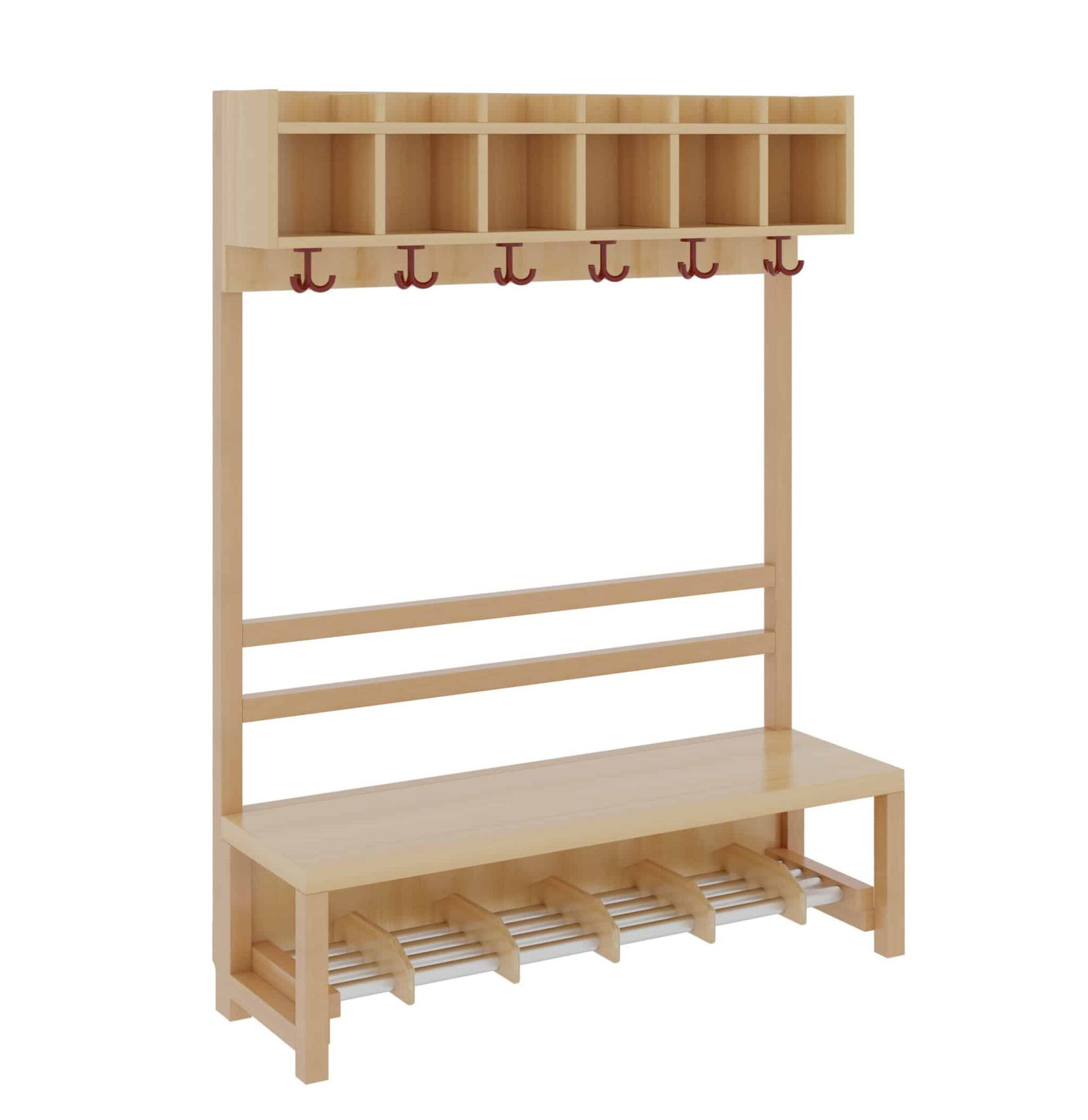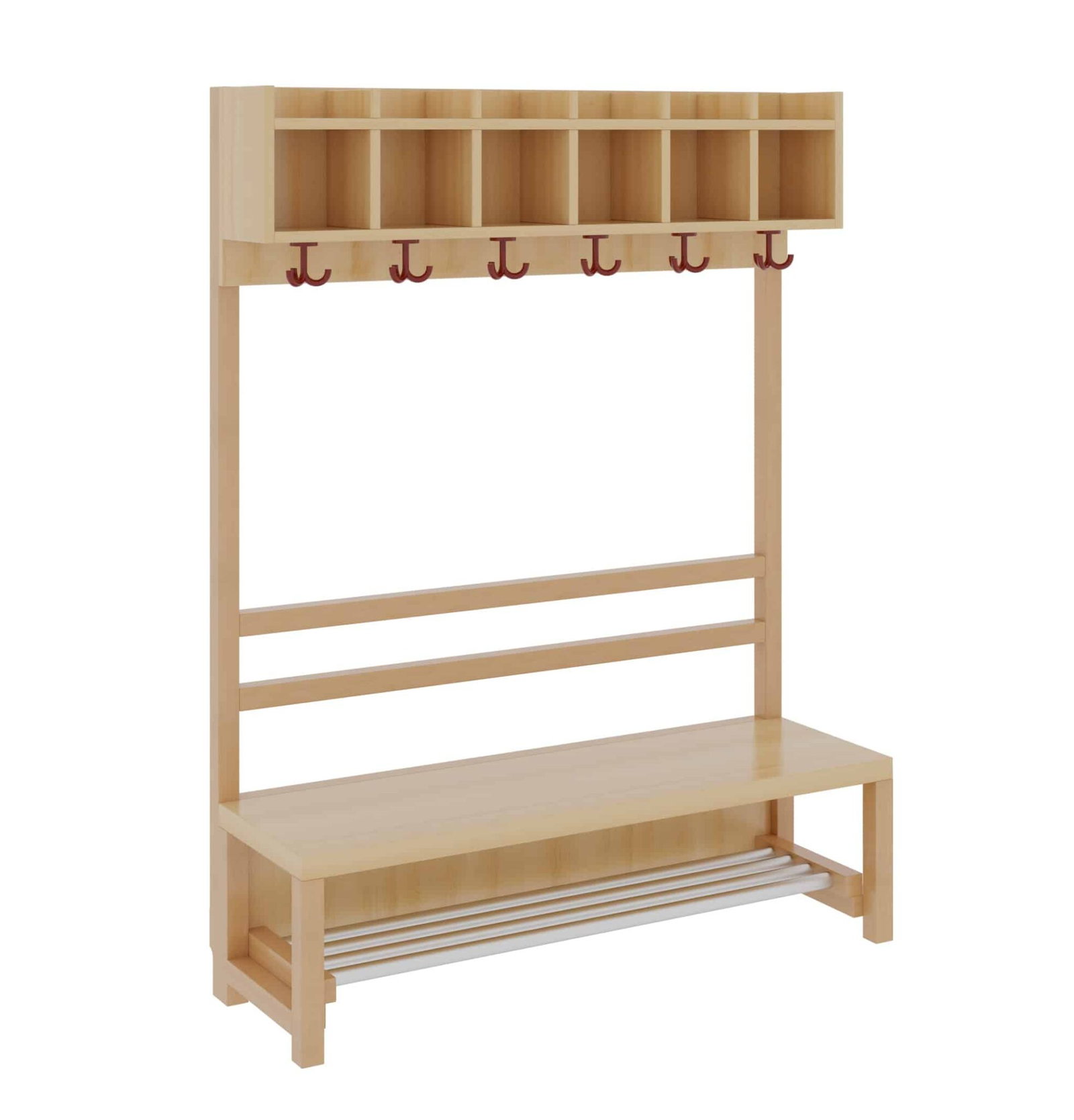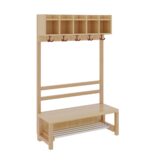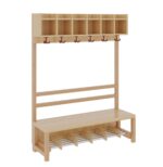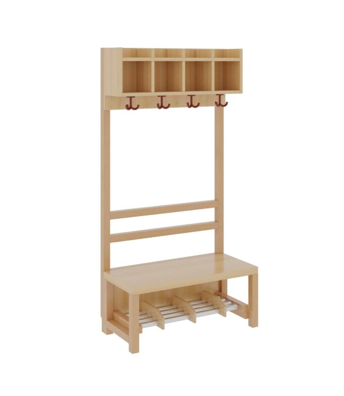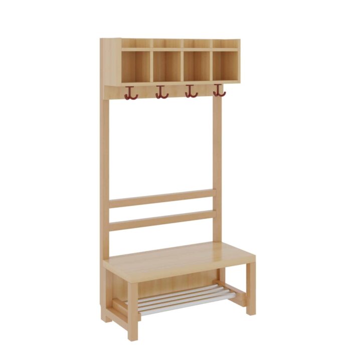 Unsere Komplettgarderobe mit einfacher Ablagereihe bietet viel Platz zur sorgfältigen Aufbewahrung von Jacken, Schuhen, Rucksäcken und vielem mehr. Durch den Einsatz von Massivholzstollen in Stütze und Bank ist diese besonders robust und langlebig, wodurch sie auch spielenden Kindern standhält. Die Garderobe eignet sich daher ideal für den Einsatz in Krippe, Hort oder Kita. Diese Variante beinhaltet zudem eine offene Stütze, sowie einen Aluminiumrost zur Schuhablage. Die Garderobe ist Ihren Anforderungen entsprechend hinsichtlich Sitzhöhe (26cm/34cm/42cm), Hakenfarbe und Platzanzahl (4/5/6/7) konfigurierbar.