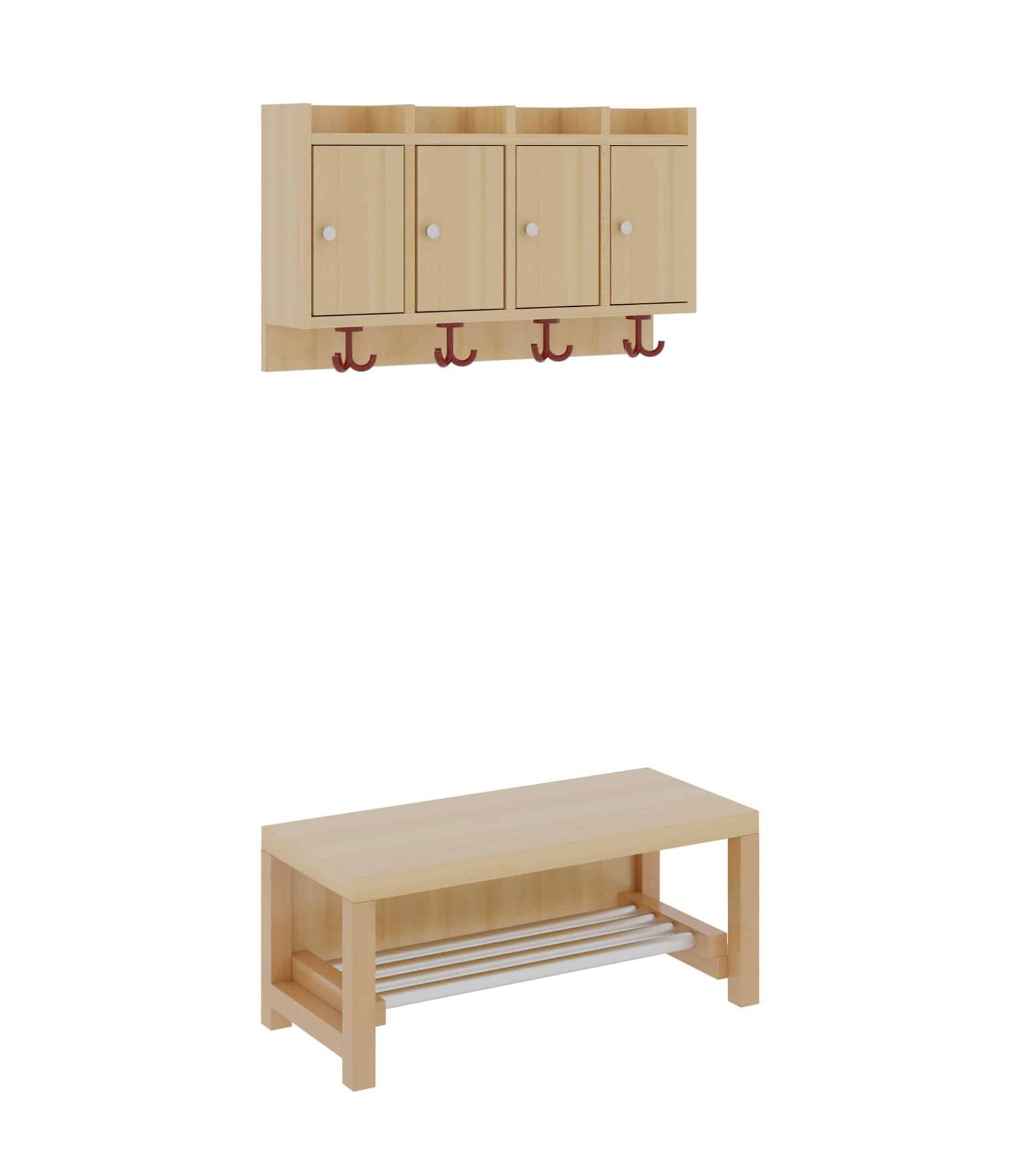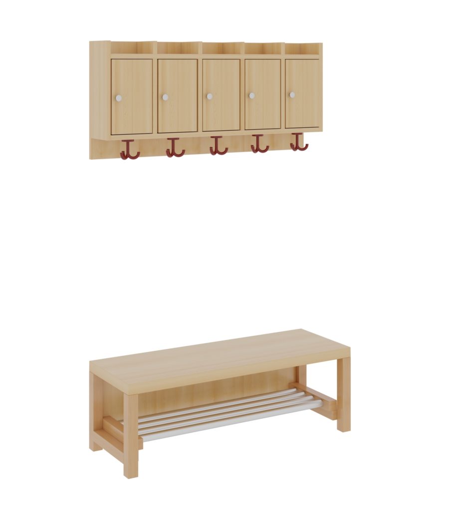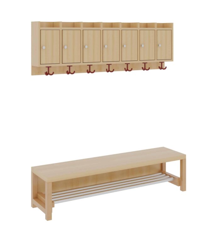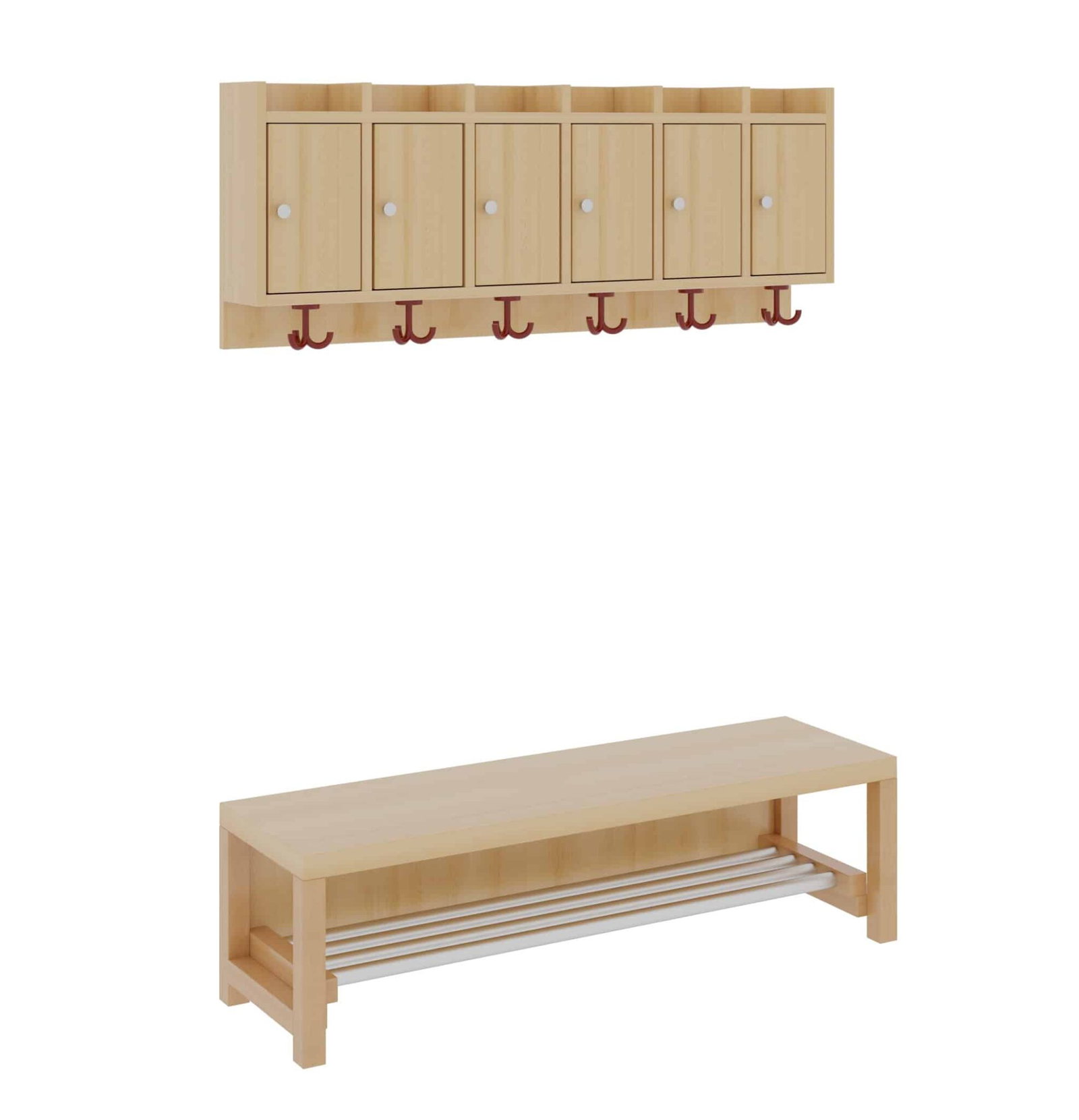 Ob Jacke, Mütze, Schuhe oder Lieblingsspielzeug: Unsere Komplettgarderobe mit Ablagen und Türen bietet reichlich Möglichkeiten zum Verstauen derartiger Gegenstände. Die große Ablage ist durch Türen in Fächer unterteilt. So können Sie jedes Fach einem Kind zuteilen, wodurch alles seinen festen Platz hat und leicht wiedergefunden werden kann. Stilvoll und dennoch unaufdringlich fügt sich das Design unserer Kinder Garderobe in Ihren Ankleidebereich ein. Zur weiteren Individualisierung kann das Frontdekor der Türen für einen Aufpreis je Garderobe angepasst werden. Bitte beachten Sie, dass diese Kita Garderobe an der Wand montiert wird. Eine professionelle Wandmontage können Sie bei Bedarf dazubuchen. Diese Variante beinhaltet eine Ablage zur Wandmontage und einen Aluminiumrost zur Schuhablage. Die Kinder Garderobe ist Ihren Anforderungen entsprechend hinsichtlich Sitzhöhe (26cm/34cm/42cm), Hakenfarbe und Platzanzahl (4/5/6/7) konfigurierbar.