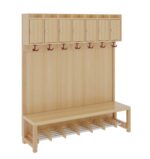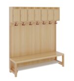 Ob Jacke, Mütze, Schuhe oder Lieblingsspielzeug: Unsere Komplettgarderobe mit Ablagen und Türen bietet reichlich Möglichkeiten zum Verstauen derartiger Gegenstände. Die große Ablage ist durch Türen in Fächer unterteilt. So können Sie jedes Fach einem Kind zuteilen, wodurch alles seinen festen Platz hat und leicht wiedergefunden werden kann. Stilvoll und dennoch unaufdringlich fügt sich das Design unserer Kinder Garderobe in Ihren Ankleidebereich ein. Zur weiteren Individualisierung kann das Frontdekor der Türen für einen Aufpreis je Garderobe angepasst werden. Bitte beachten Sie, dass diese Kita Garderobe an der Wand montiert wird. Eine professionelle Wandmontage können Sie bei Bedarf für dazubuchen. Diese Variante beinhaltet eine Stütze mit Paneelrückwand, sowie einen Aluminiumrost zur Schuhablage. Die Kinder Garderobe ist Ihren Anforderungen entsprechend hinsichtlich Sitzhöhe (26cm/34cm/42cm), Hakenfarbe und Platzanzahl (4/5/6/7) konfigurierbar.