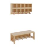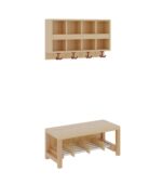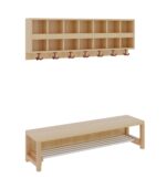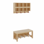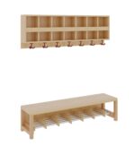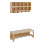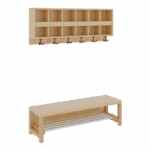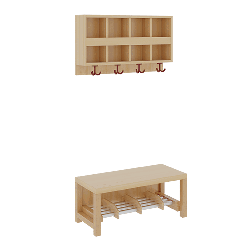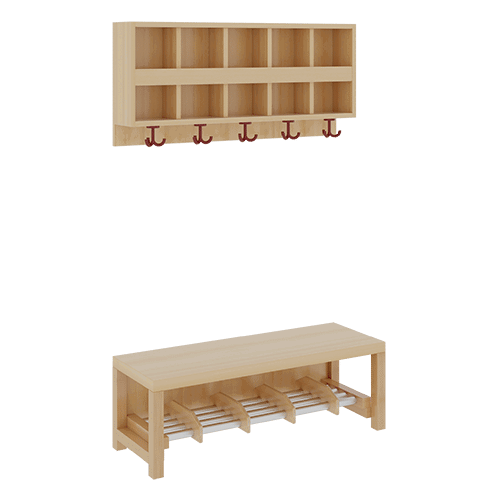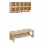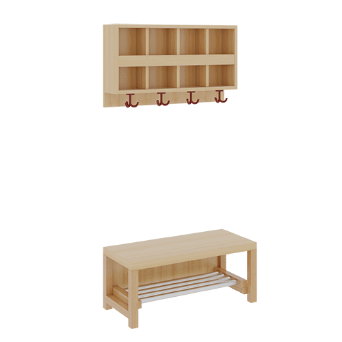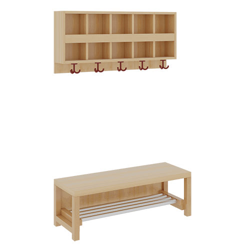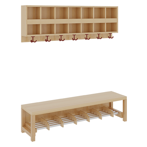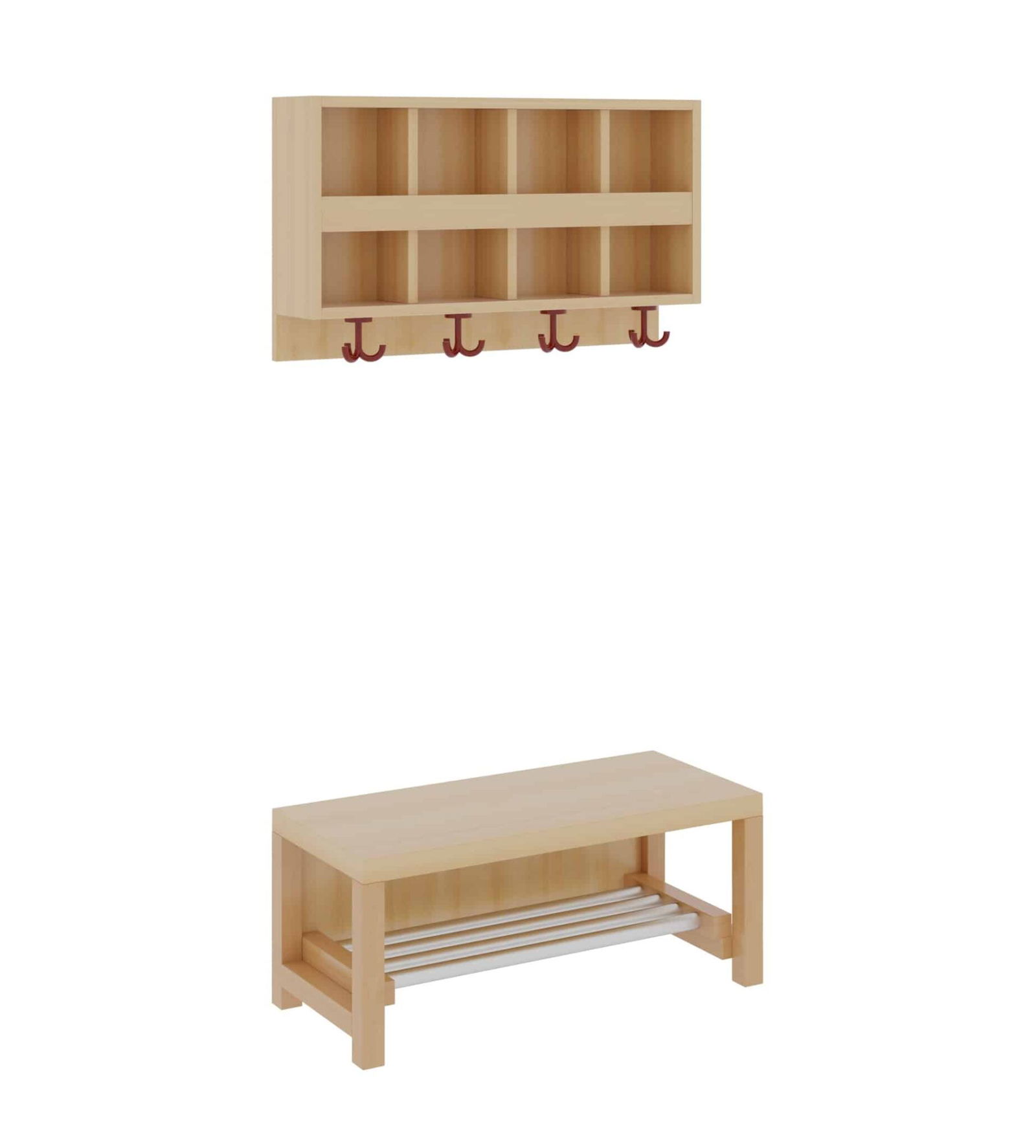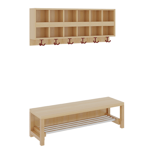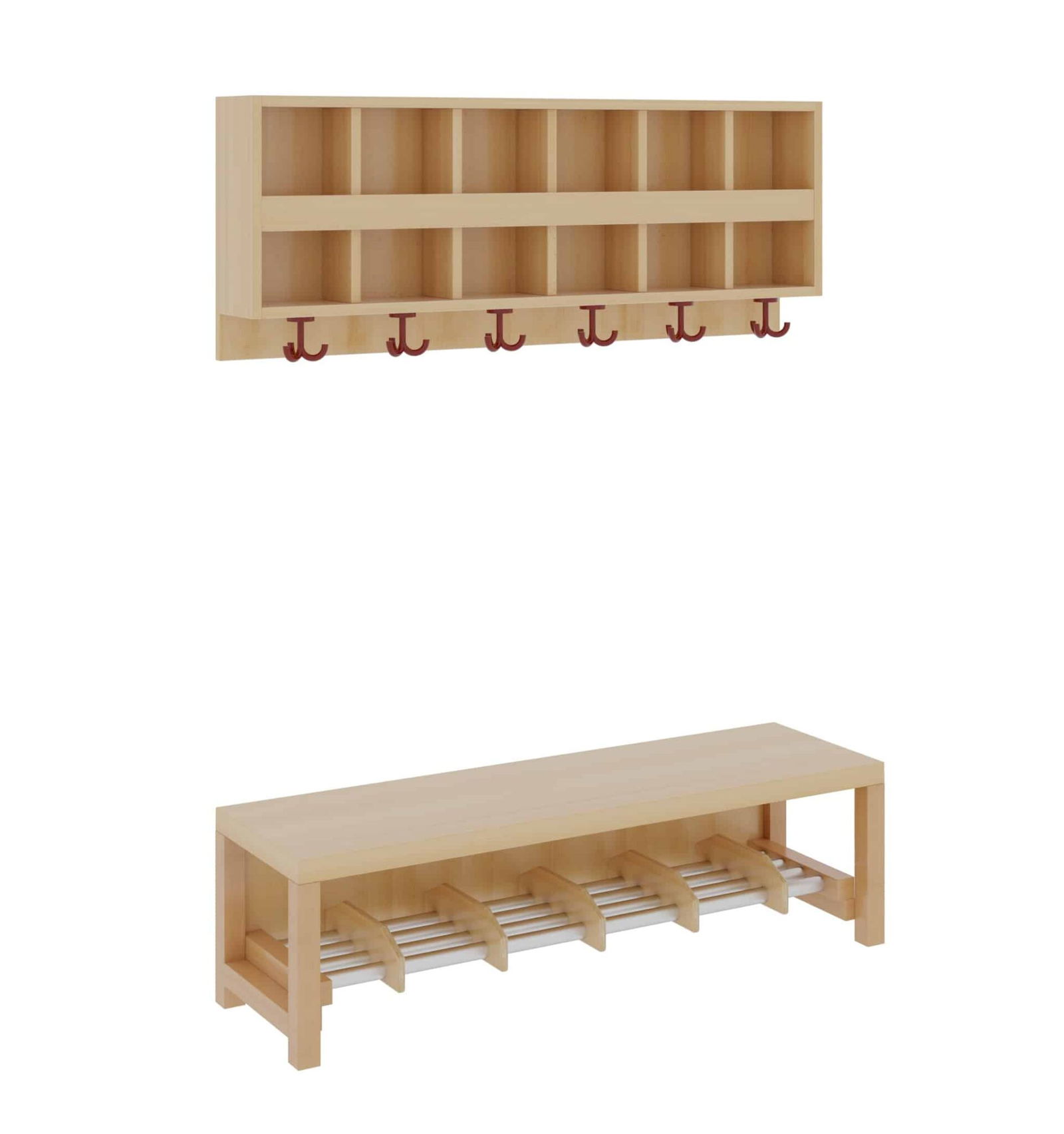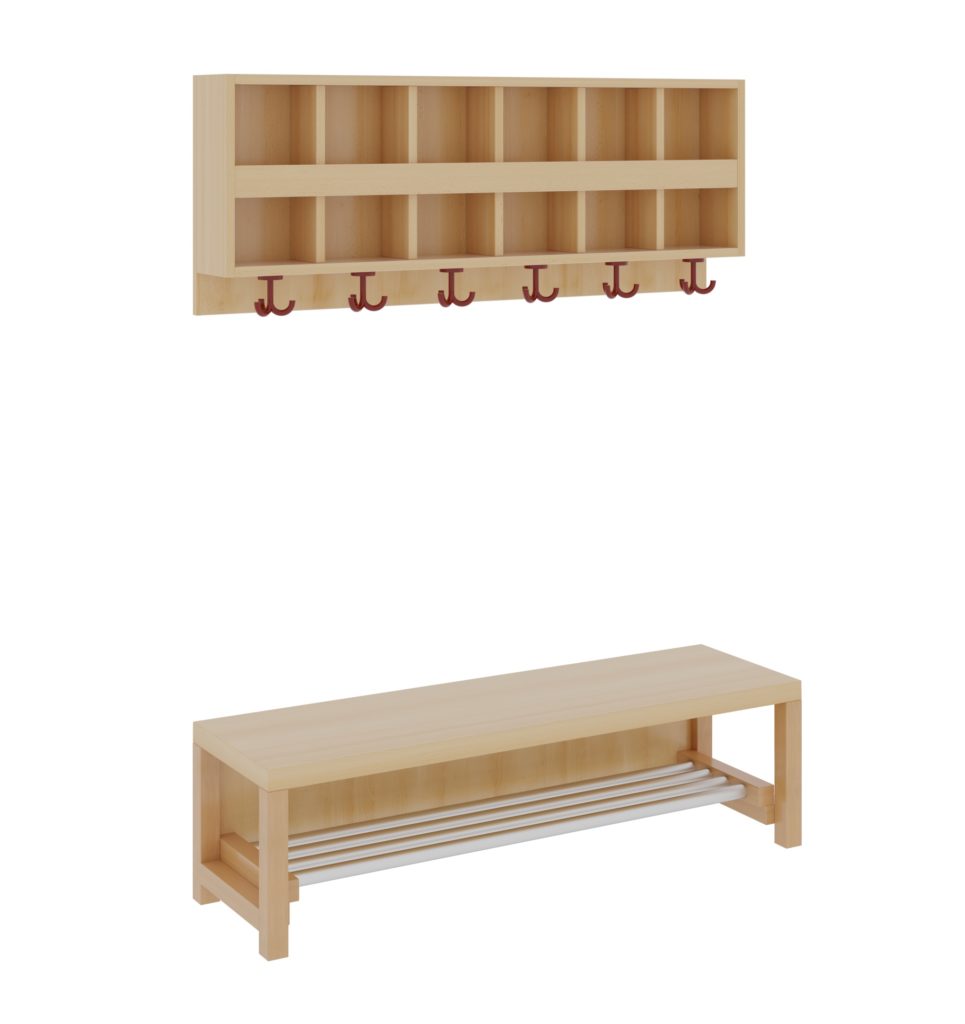 Unsere Komplettgarderobe mit doppelter Ablagereihe bietet viel Platz zur sorgfältigen Aufbewahrung von Jacken, Schuhen, Rucksäcken und vielem mehr. Durch den Einsatz von Massivholzstollen in der Bank ist diese besonders robust und langlebig, wodurch sie auch spielenden Kindern standhält. Die Garderobe eignet sich daher ideal für den Einsatz in Krippe, Hort oder Kita. Durch die integrierte Bilderleiste können Sie die einzelnen Garderobenplätze ganz nach Ihren Wünschen gestalten. So ist es beispielsweise möglich, jedem Kind durch Auswahl eines individuellen Bildes einen festen Garderobenplatz zuzuweisen. Diese Variante beinhaltet eine separat an der Wand zu montierende Ablage, sowie einen Aluminiumrost zur Schuhablage. Die Kinder Garderobe ist Ihren Anforderungen entsprechend hinsichtlich Sitzhöhe (26cm/34cm/42cm), Hakenfarbe und Platzanzahl (4/5/6/7) konfigurierbar.
