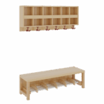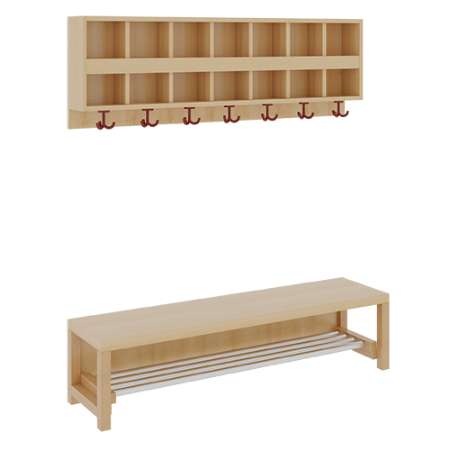 Unsere Komplettgarderobe mit doppelter Ablagereihe bietet viel Platz zur sorgfältigen Aufbewahrung von Jacken, Schuhen, Rucksäcken und vielem mehr. Durch den Einsatz von Massivholzstollen in der Bank ist diese besonders robust und langlebig, wodurch sie auch spielenden Kindern standhält. Die Garderobe eignet sich daher ideal für den Einsatz in Krippe, Hort oder Kita. Durch die integrierte Bilderleiste können Sie die einzelnen Garderobenplätze ganz nach Ihren Wünschen gestalten. So ist es beispielsweise möglich, jedem Kind durch Auswahl eines individuellen Bildes einen festen Garderobenplatz zuzuweisen. Diese Variante beinhaltet eine separat an der Wand zu montierende Ablage, sowie einen Aluminiumrost zur Schuhablage. Die Kinder Garderobe ist Ihren Anforderungen entsprechend hinsichtlich Sitzhöhe (26cm/34cm/42cm), Hakenfarbe und Platzanzahl (4/5/6/7) konfigurierbar.