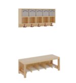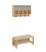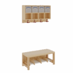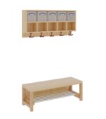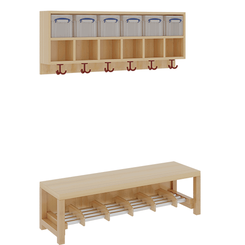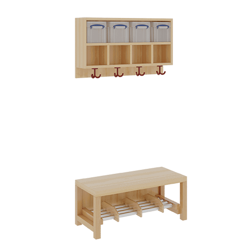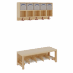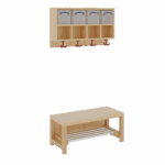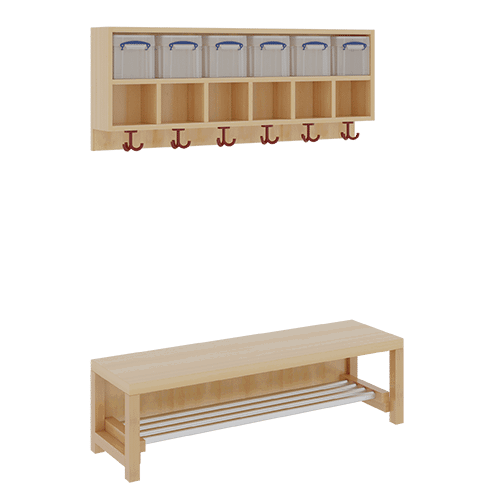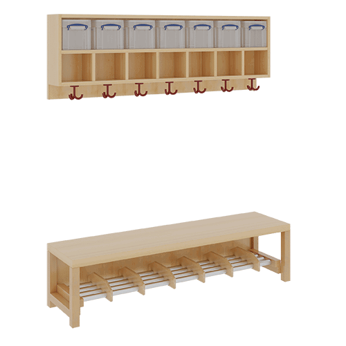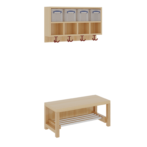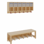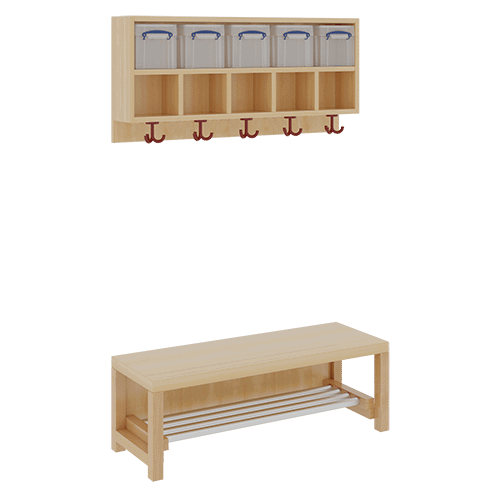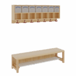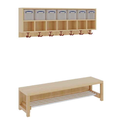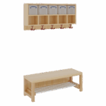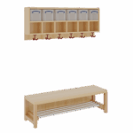 Unsere Komplettgarderobe mit doppelter Ablagereihe bietet viel Platz zur sorgfältigen Aufbewahrung von Jacken, Schuhen, Rucksäcken und vielem mehr. Durch den Einsatz von Massivholzstollen in Stütze und Bank ist diese besonders robust und langlebig, wodurch sie auch spielenden Kindern standhält. Die Garderobe eignet sich daher ideal für den Einsatz in Krippe, Hort oder Kita. In den mitgelieferten Boxen für die Ablage können Gegenstände sicher und organisiert verstaut werden, wodurch keine Gegenstände verloren gehen oder unter den Kindern vertauscht werden können. Diese Variante beinhaltet zudem eine Stütze mit Paneelrückwand, sowie einen Aluminiumrost zur Schuhablage. Die Kinder Garderobe ist Ihren Anforderungen entsprechend hinsichtlich Sitzhöhe (26cm/34cm/42cm), Hakenfarbe und Platzanzahl (4/5/6/7) konfigurierbar.