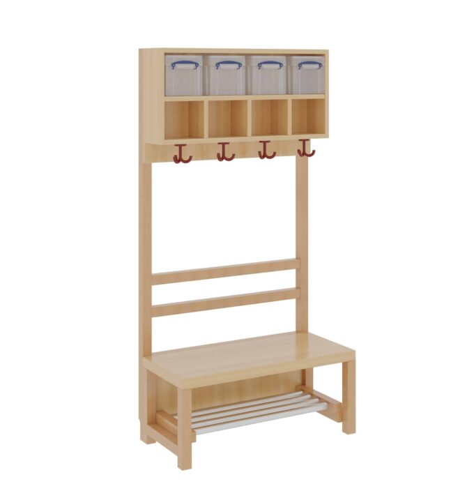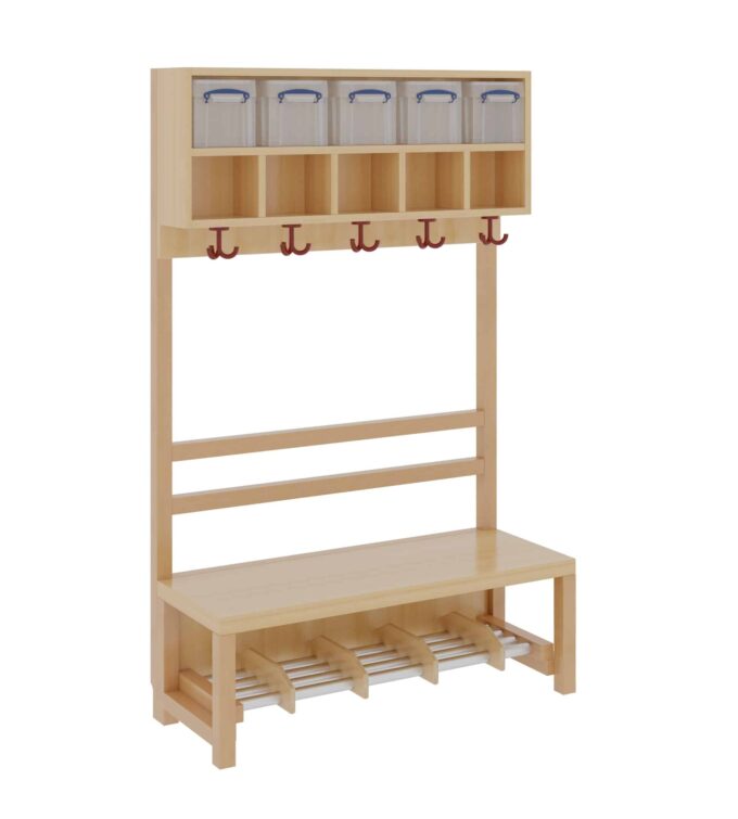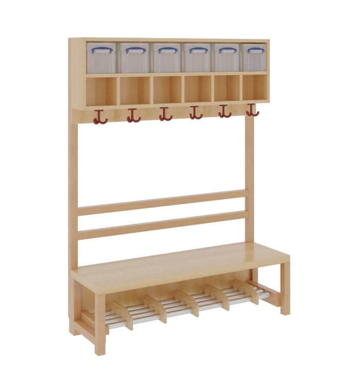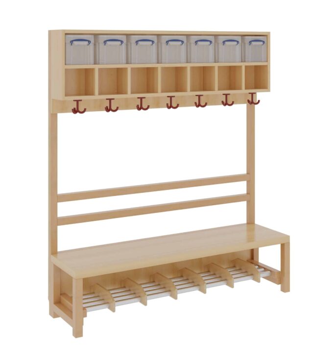 Komplettgarderobe mit Doppelablage & Boxen – offene Stütze & Aluminiumrost für Kindergarten & Krippen