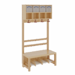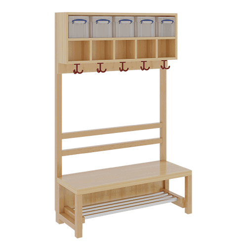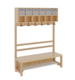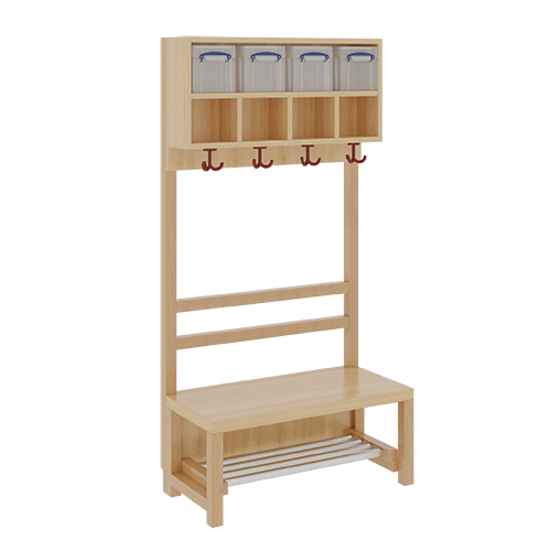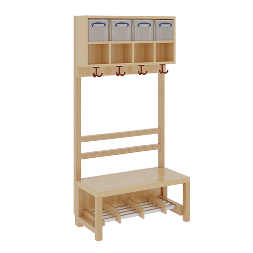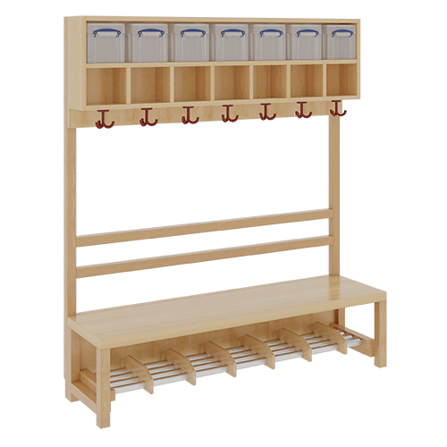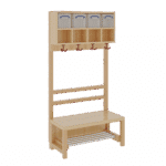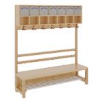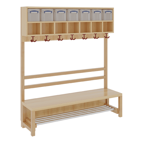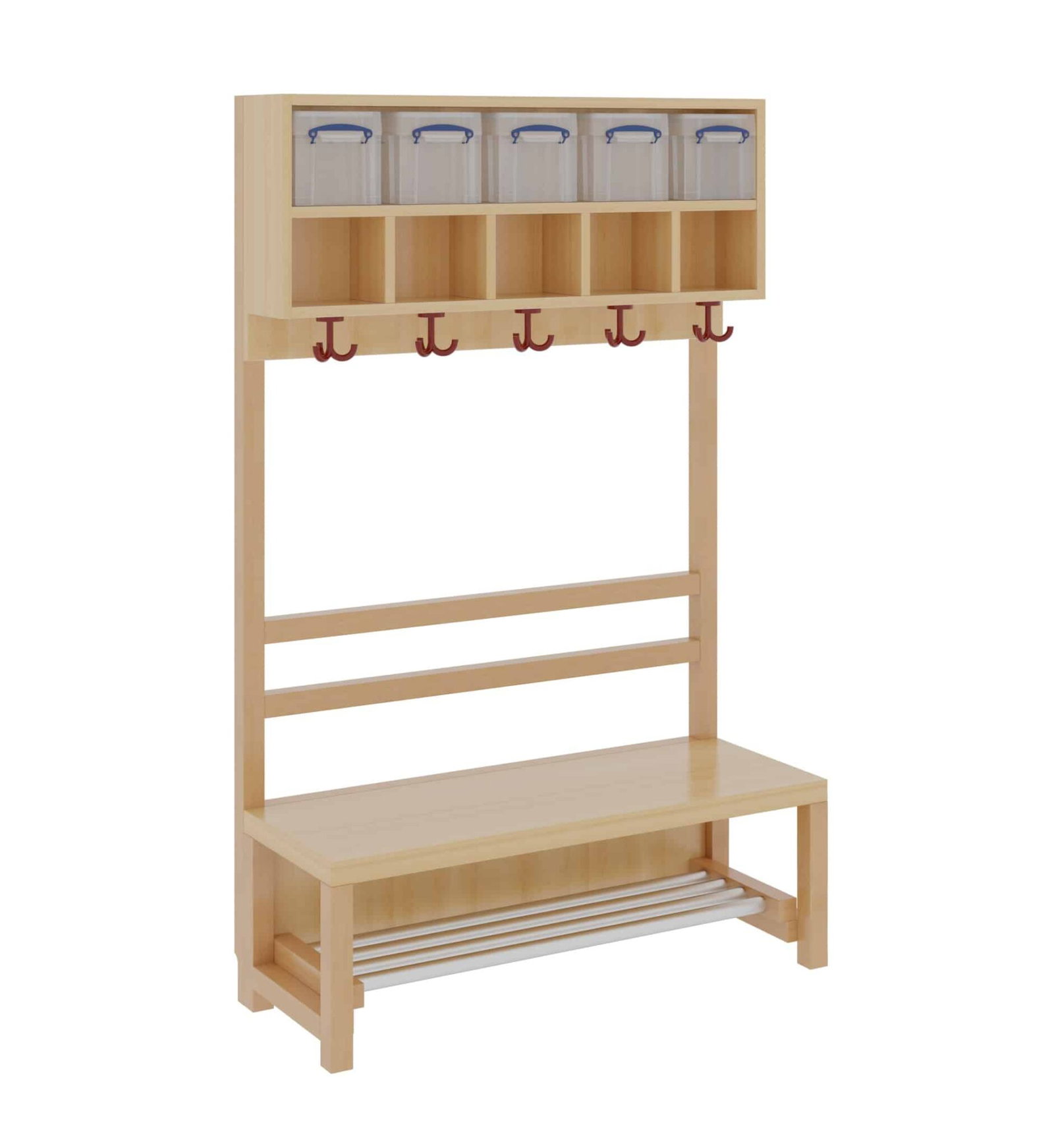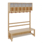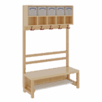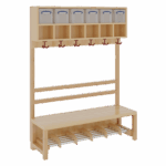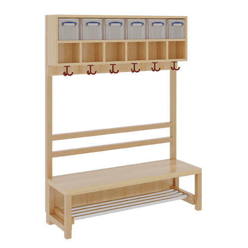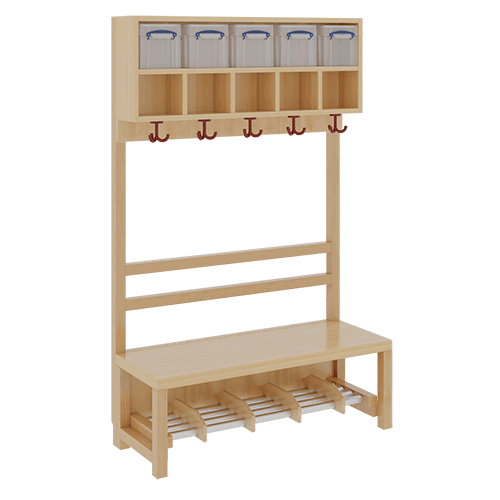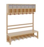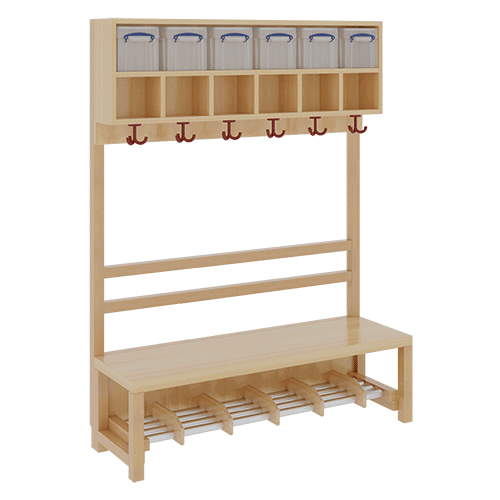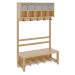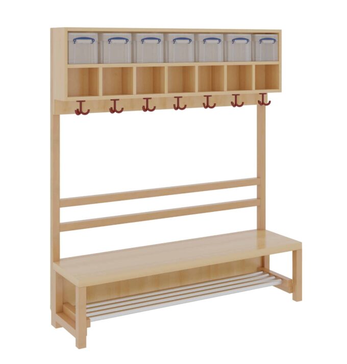 Unsere Komplettgarderobe mit doppelter Ablagereihe bietet viel Platz zur sorgfältigen Aufbewahrung von Jacken, Schuhen, Rucksäcken und vielem mehr. Durch den Einsatz von Massivholzstollen in Stütze und Bank ist diese besonders robust und langlebig, wodurch sie auch spielenden Kindern standhält. Die Garderobe eignet sich daher ideal für den Einsatz in Krippe, Hort oder Kita. In den mitgelieferten Boxen für die Ablage können Gegenstände sicher und organisiert verstaut werden, wodurch keine Gegenstände verloren gehen oder unter den Kindern vertauscht werden können. Die Garderobenstützen haben rückseitig eine Ausklinklung (H/T 8 x 1,5 cm) für Sockelleisten. Diese Variante beinhaltet eine offene Stütze, sowie einen Aluminiumrost zur Schuhablage. Die Kinder Garderobe ist Ihren Anforderungen entsprechend hinsichtlich Sitzhöhe (26cm/34cm/42cm), Hakenfarbe und Platzanzahl (4/5/6/7) konfigurierbar.