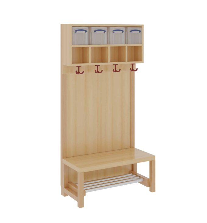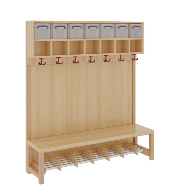 Komplettgarderobe mit Doppelablage & Boxen – Stütze mit Paneelrückwand & Aluminiumrost für Kindergarten & Krippen