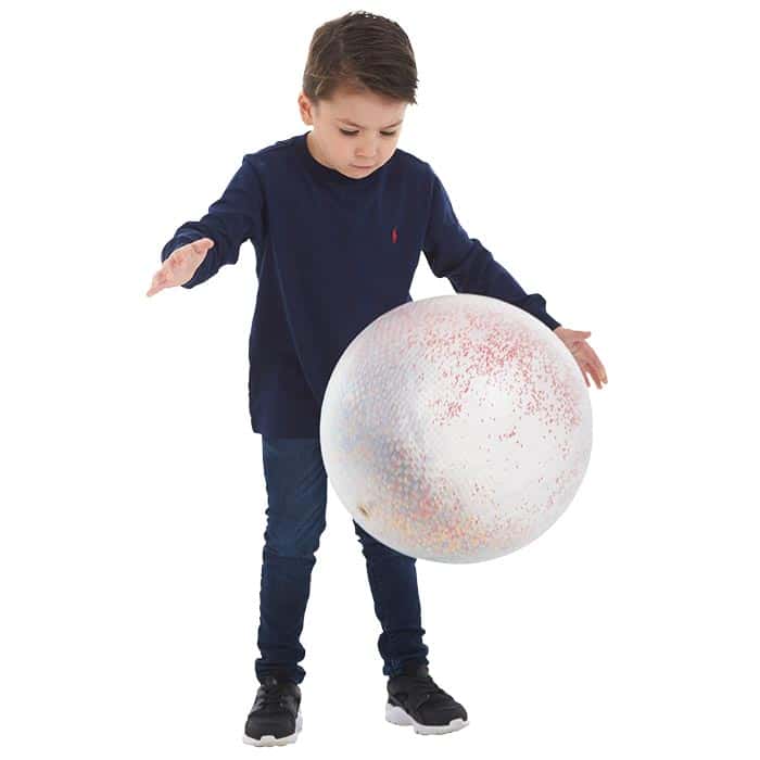 Ein Blickfang, der begeistert.- Buntes Innenleben: Die bunten Kunststoffplättchen im Inneren des transparenten Balls bewegen sich bei jeder Drehung mit. Dieser visuelle Effekt fesselt die Aufmerksamkeit, fördert die visuelle Wahrnehmung und motiviert Kinder, den Ball immer wieder in Bewegung zu versetzen.