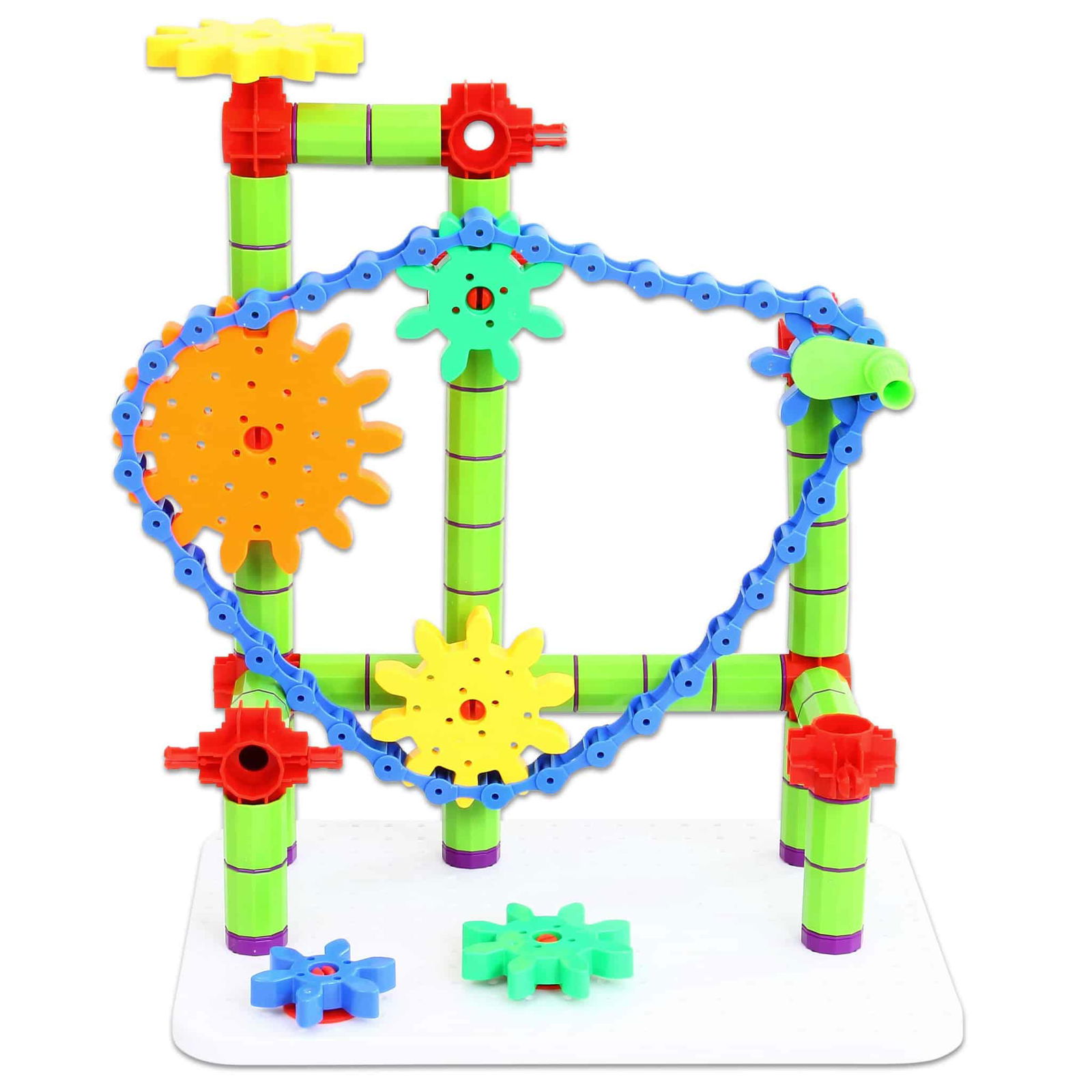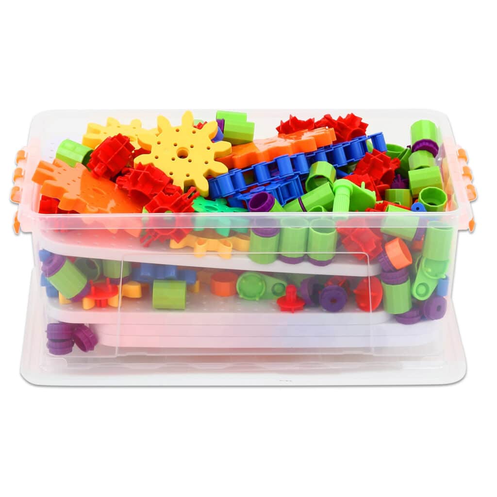 Die verschiedenen Zahnräder lassen sich einfach auf den robusten Steckplatten kombinieren, sei es nach einer Anleitung oder immer wieder neu durch Experimentieren. Alle Teile sind aus unzerbrechlichem und abwaschbarem Plastik gefertigt, was eine lange Lebensdauer und einfache Pflege garantiert.