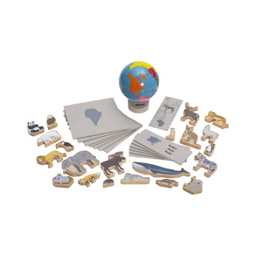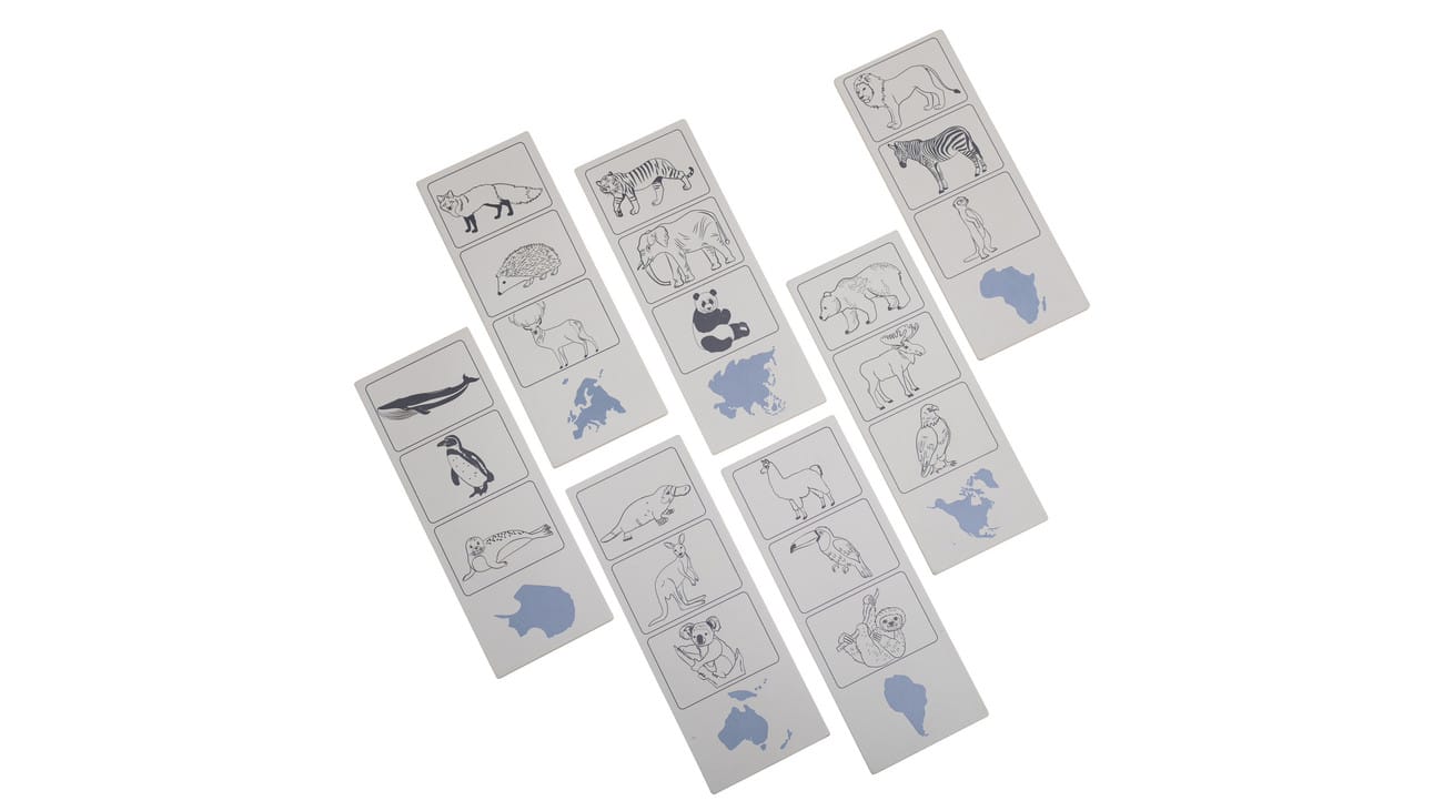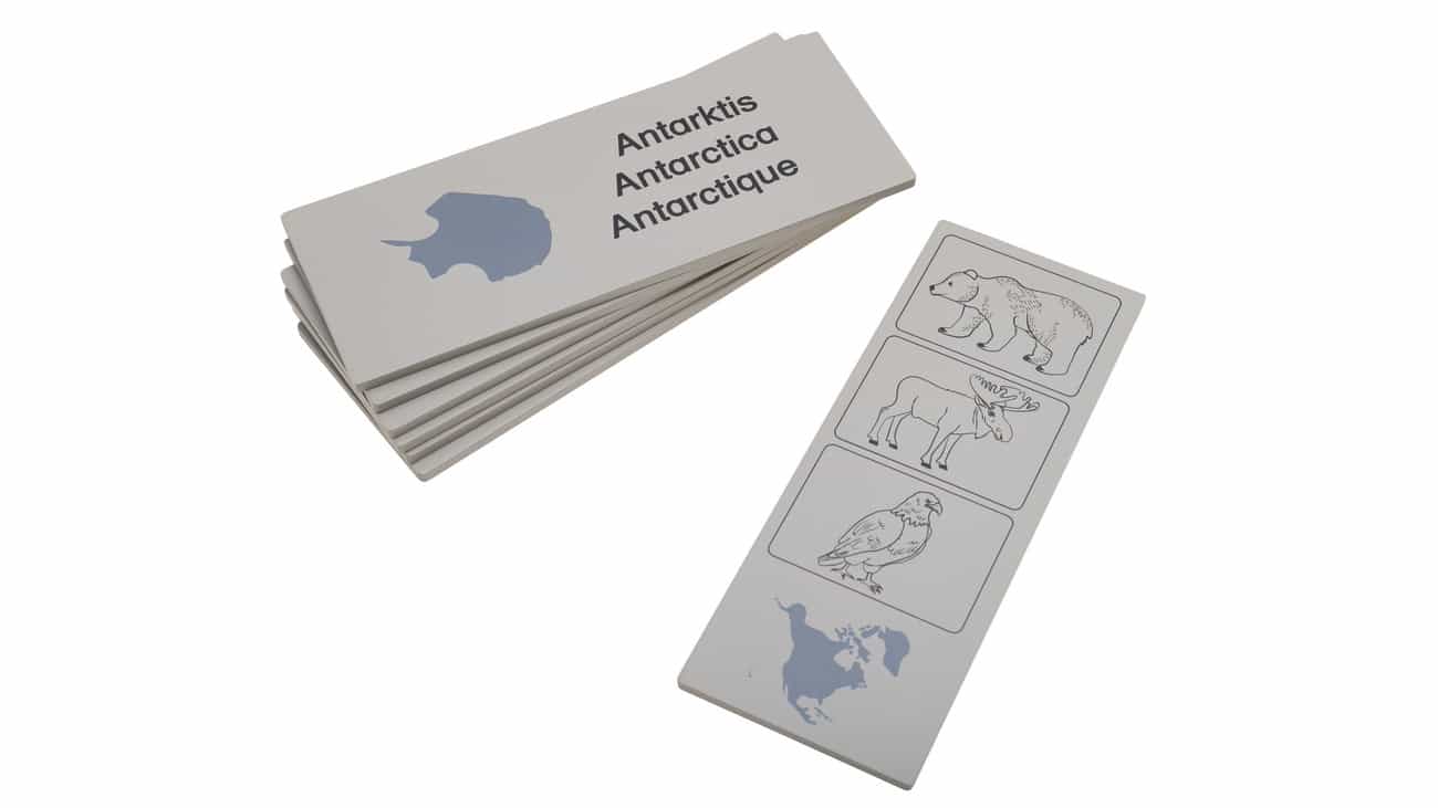 Mit 7 beidseitig bedruckten Kontrollplatten können die Kinder ihre Kenntnisse direkt überprüfen und verfeinern. Diese Platten sind mit Bildern von Tieren sowie den Namen der Kontinente in verschiedenen Sprachen versehen, was das gesamte Set ideal für den bilingualen Unterricht macht.