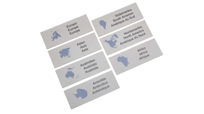 Mit 7 beidseitig bedruckten Kontrollplatten können die Kinder ihre Kenntnisse direkt überprüfen und verfeinern. Diese Platten sind mit Bildern von Tieren sowie den Namen der Kontinente in verschiedenen Sprachen versehen, was das gesamte Set ideal für den bilingualen Unterricht macht.